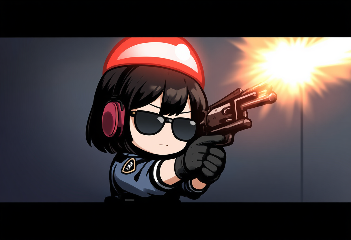 girl, sunglasses, black hair, short hair,red police siren light on head, {{{chibi}}}, police, revolver, muzzle flash, earmuffs, extend both arms forward