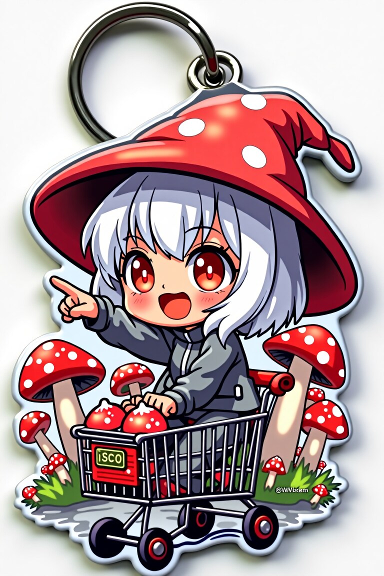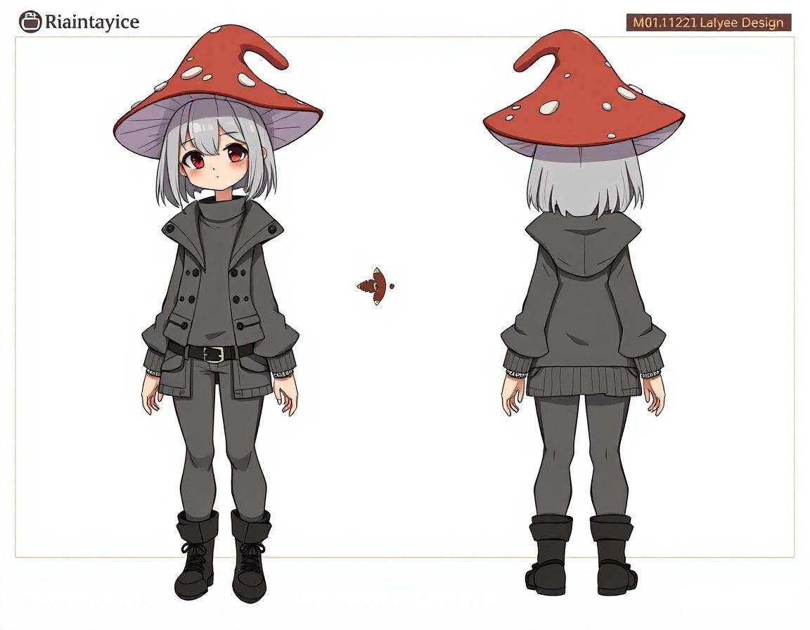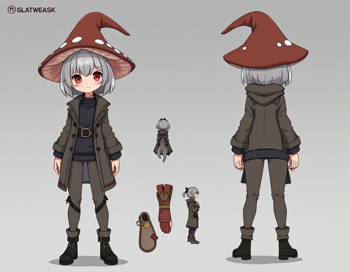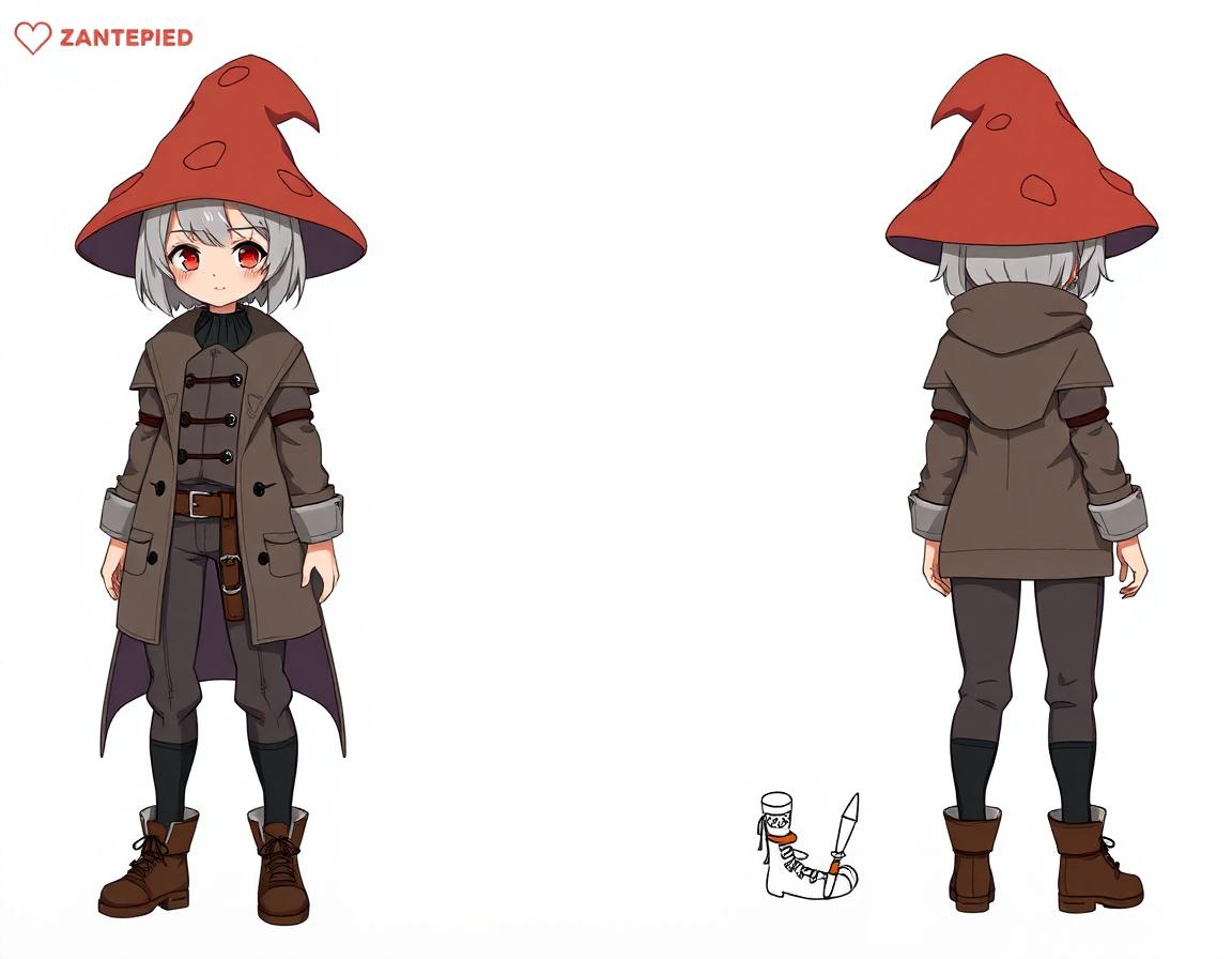 girl silver-short-bob-hair red-eyes mushroom-witch mushroom-witch-hat gray-duffle-coat pants