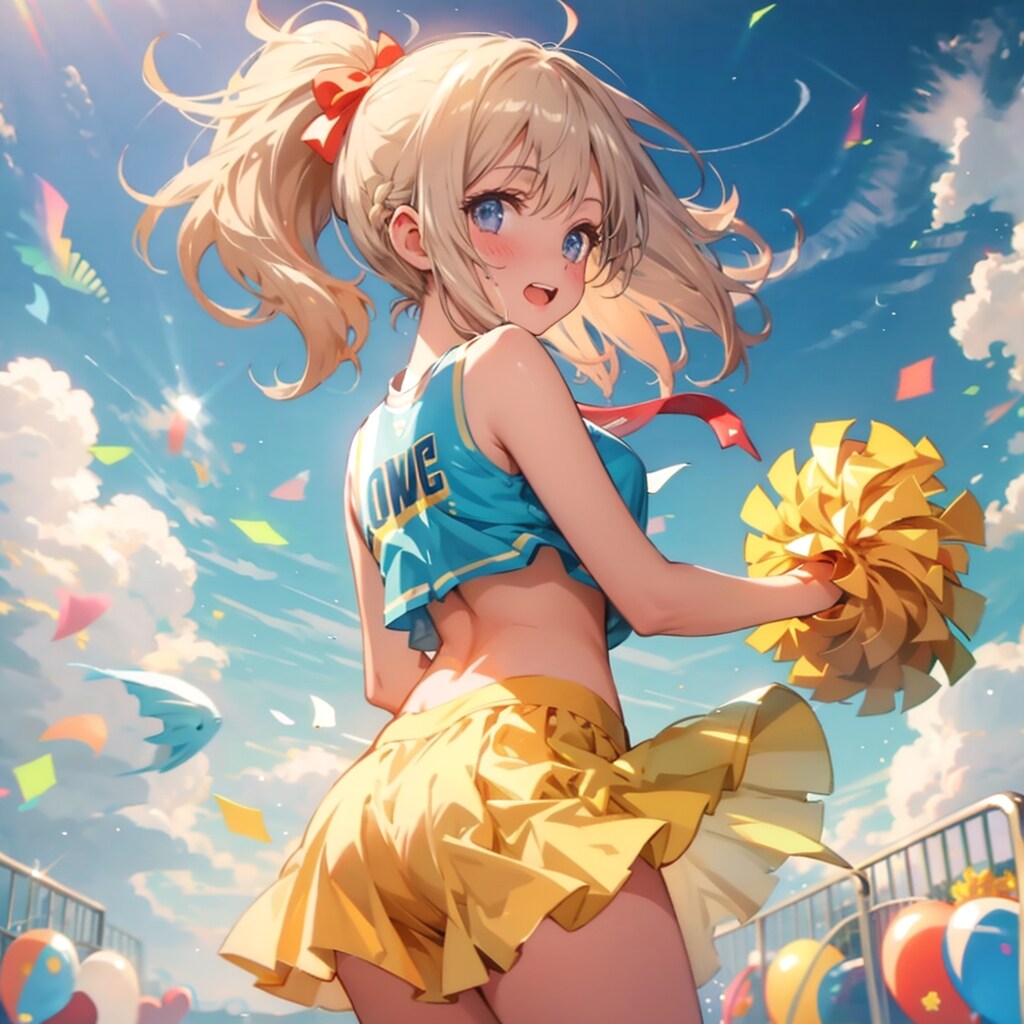 いっぱい風船を持つブロンドポニーテールのチアガールの美女。