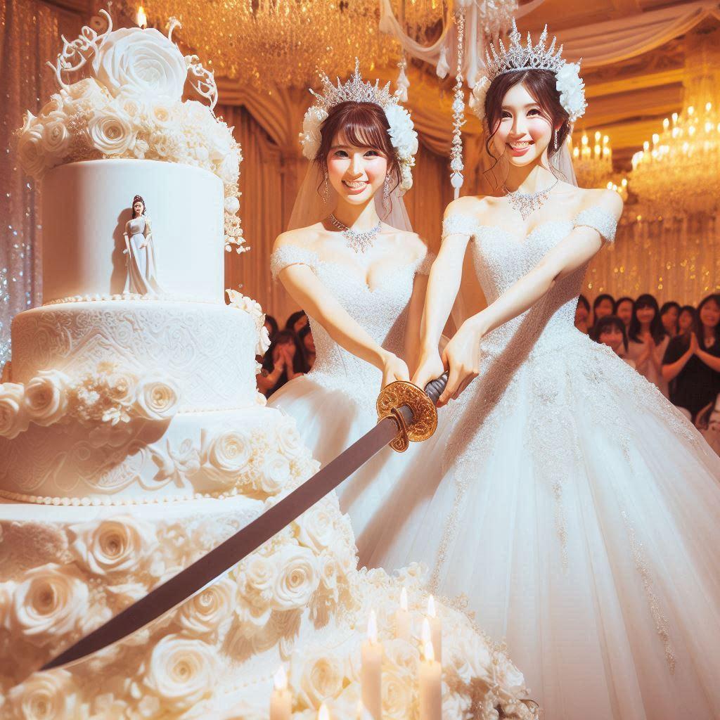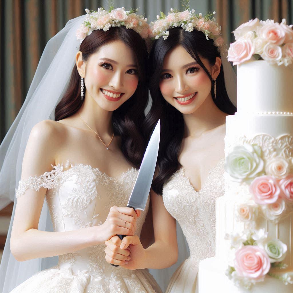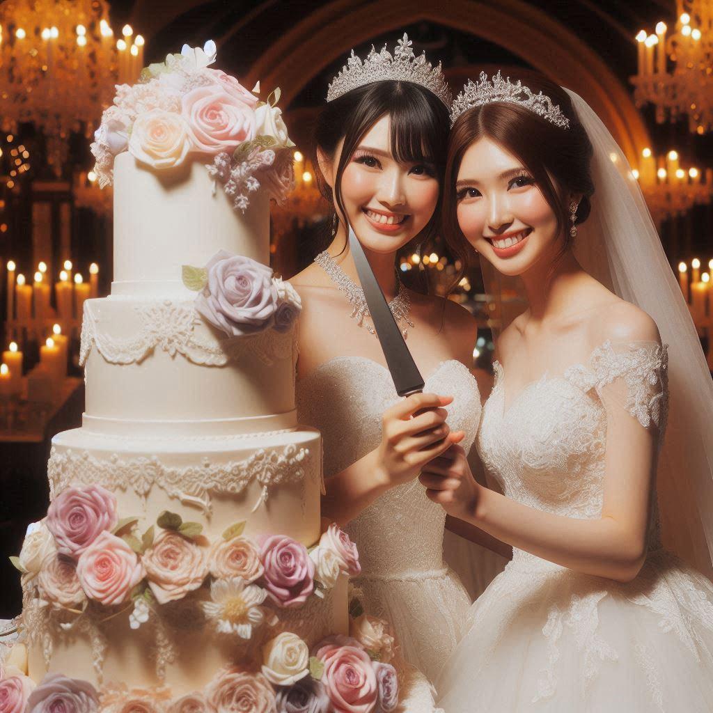 「さぁ、花嫁と花嫁のケーキ入刀です」