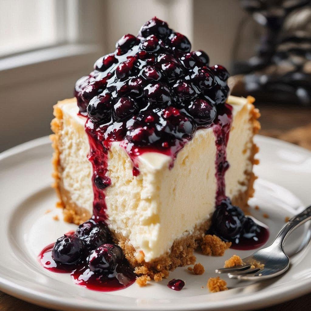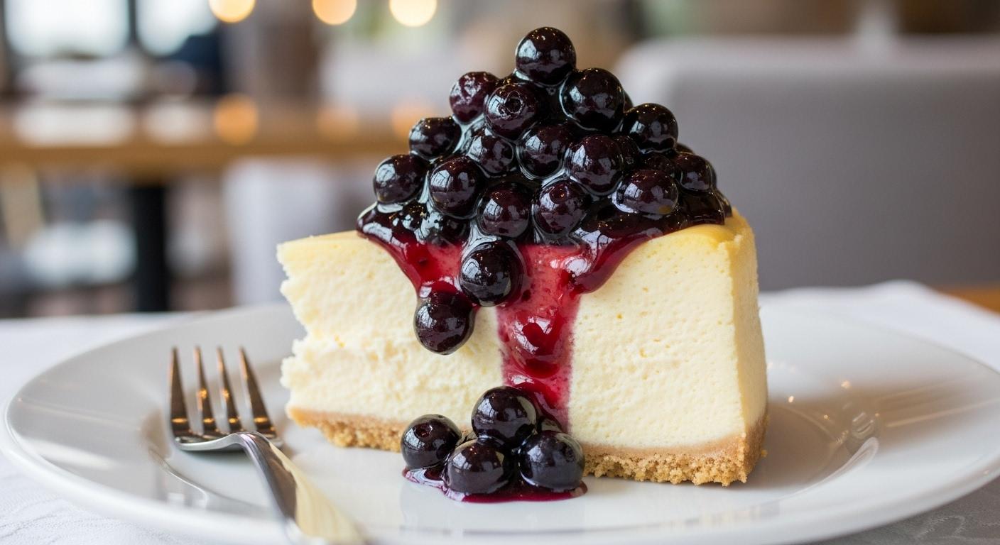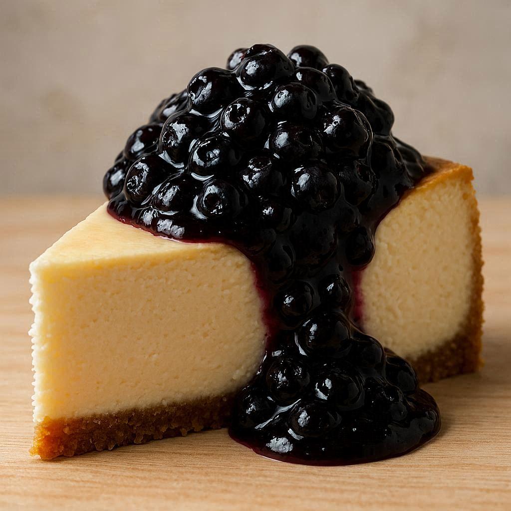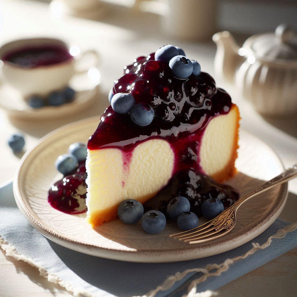 ベイクドチーズケーキに山盛りのブルーベリージャムが載っています。