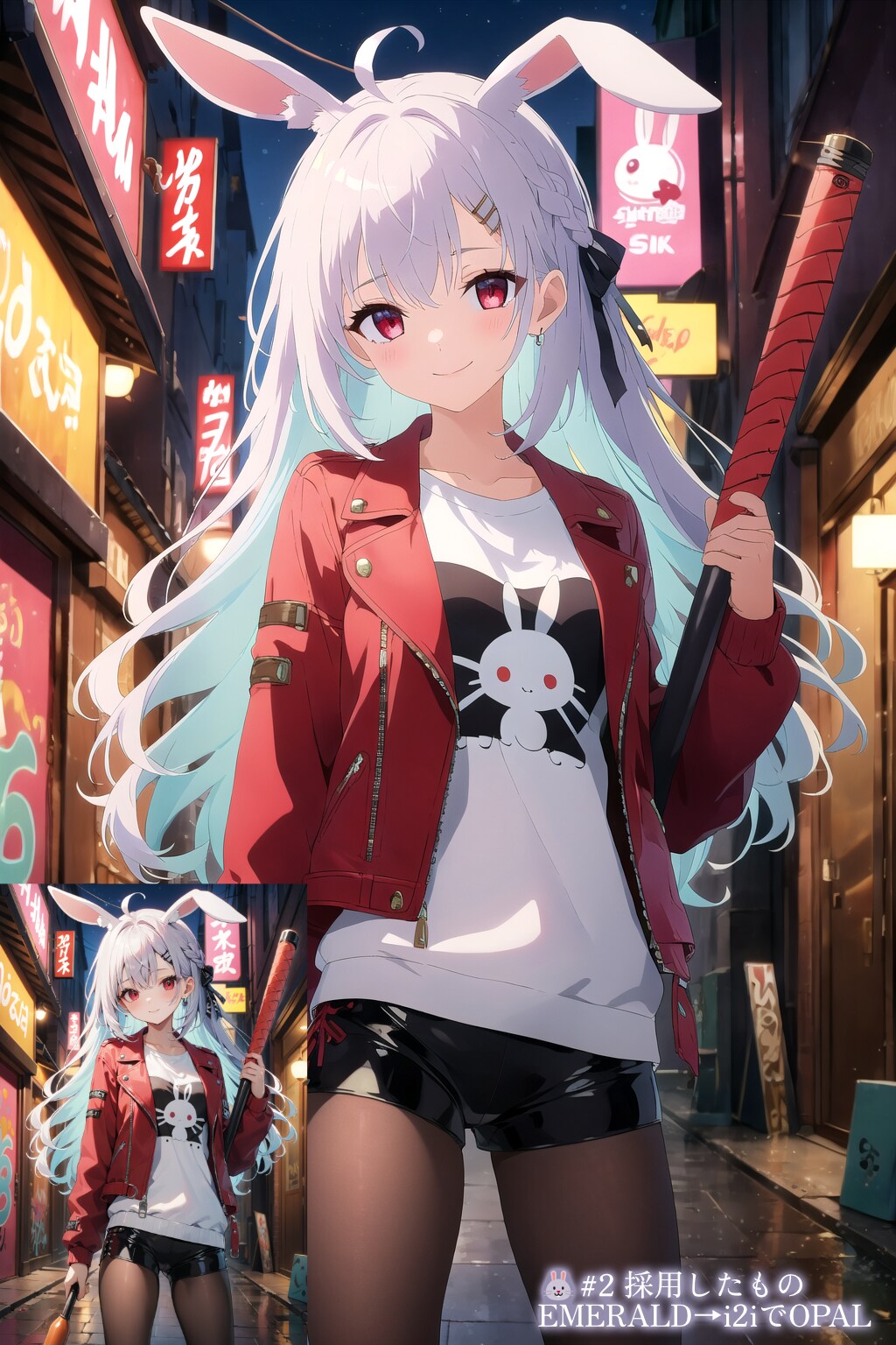 ・ふつうに創ると面白みに欠けるかなあと思って、今回は各モデルで同一呪文ランダムSeedでt2iした後、OPALにi2iしたものから選ぶという手法をとっています。OPAL単体だと出ない線がいろいろ出て表現が広がりますね。1枚目に採用したものはEMERALDです。すべてストレングス0.5、ノイズ0.5でやっています。(2枚目以降参照)
