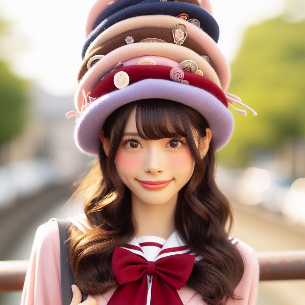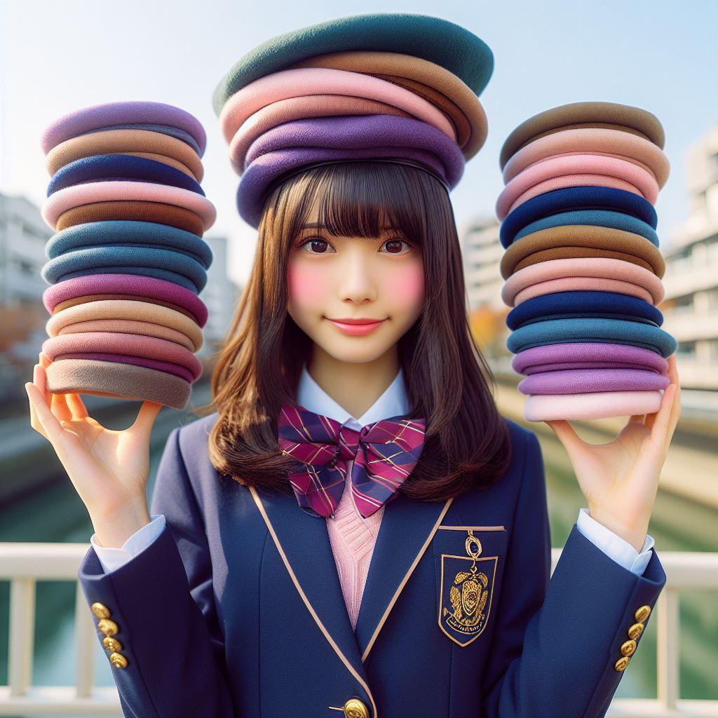 ベレー帽を何個重ねてかぶれるのかに挑戦している女子高生。