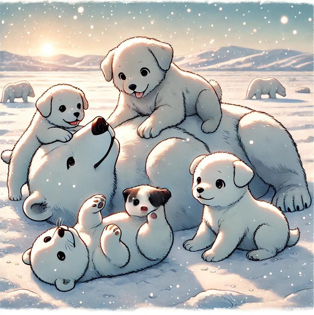 しかし、その中にひとつだけ、ちょっぴり違う姿が混ざっていた。モフモフだけど、耳がぴんっと立っていて、シロクマよりもひとまわり小さい。でも、そんなことは気にしない。みんな一緒に転がって、笑顔で雪まみれになる。