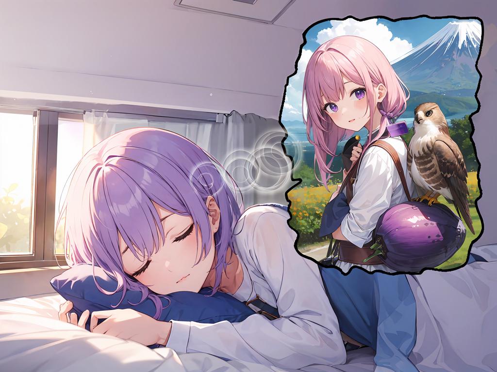 「寝てる女の子」と「富士山、茄子、鷹」で別々に作成したイラストをまとめました(^^;