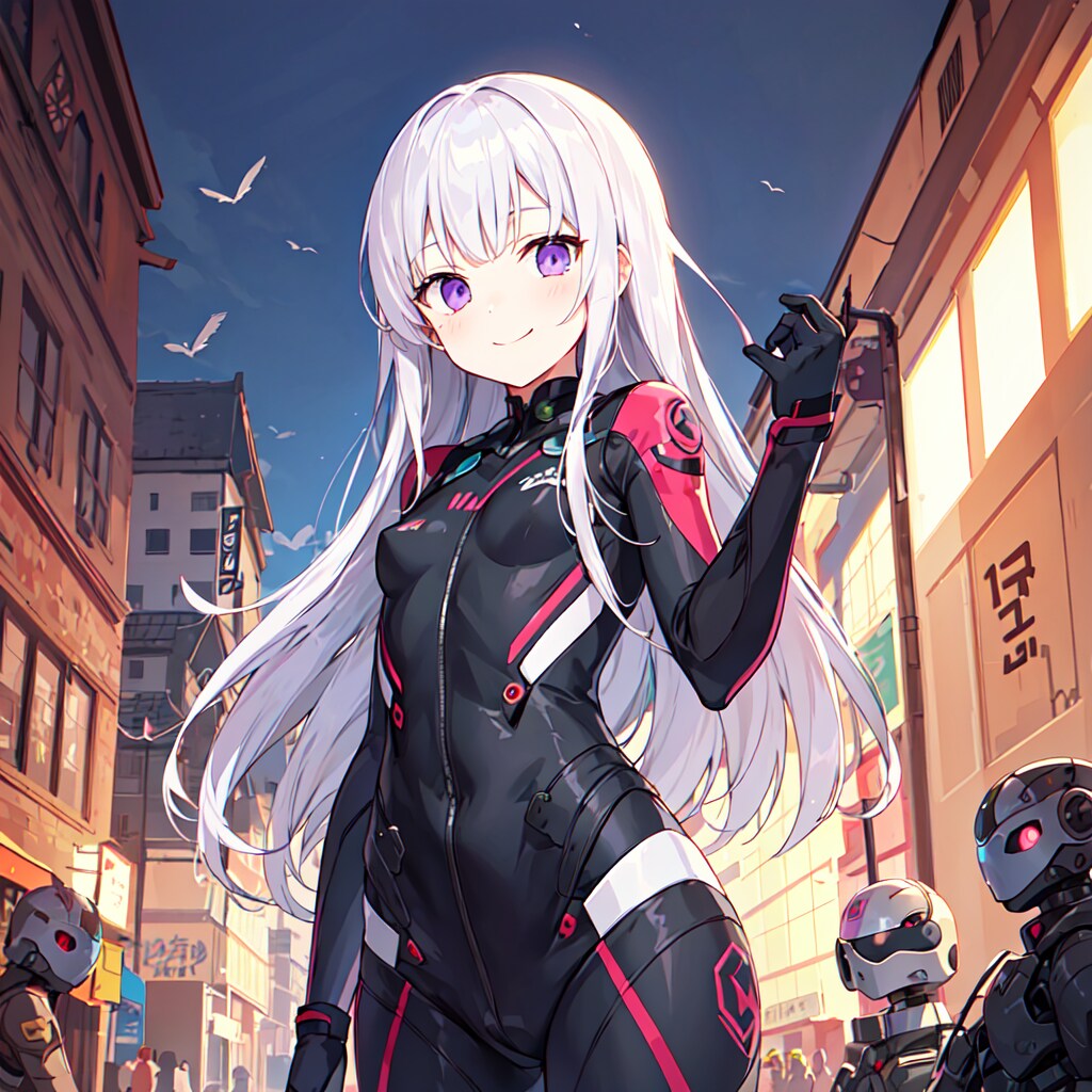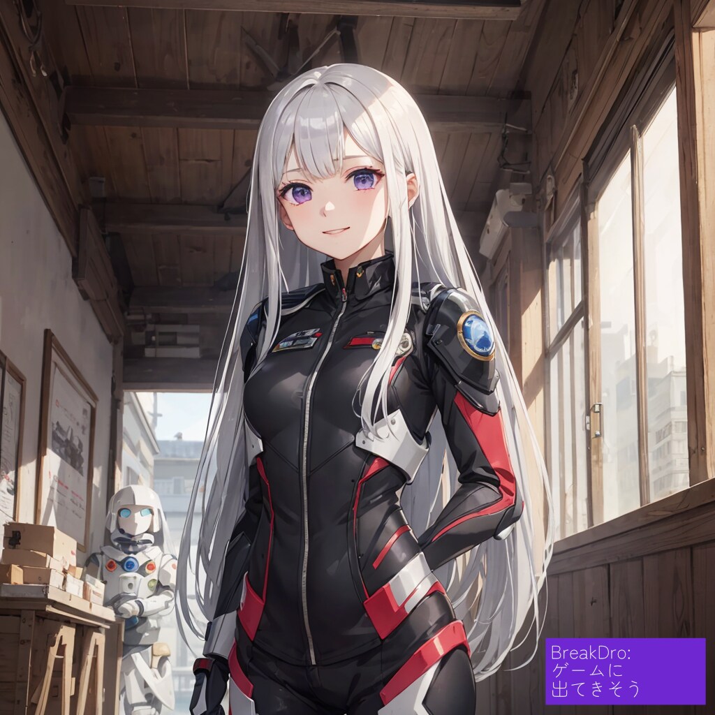 元からロボットアニメとかに出てきそうなキャラクターだったのですが、こういう系のキャラはAIさんもかなり得意ですぐに作れました。モデルはちちぷいさんのイラスト生成機能でも使えるShiratakiMixです。カラフルなのでパイロットスーツも色がいろいろつきました。