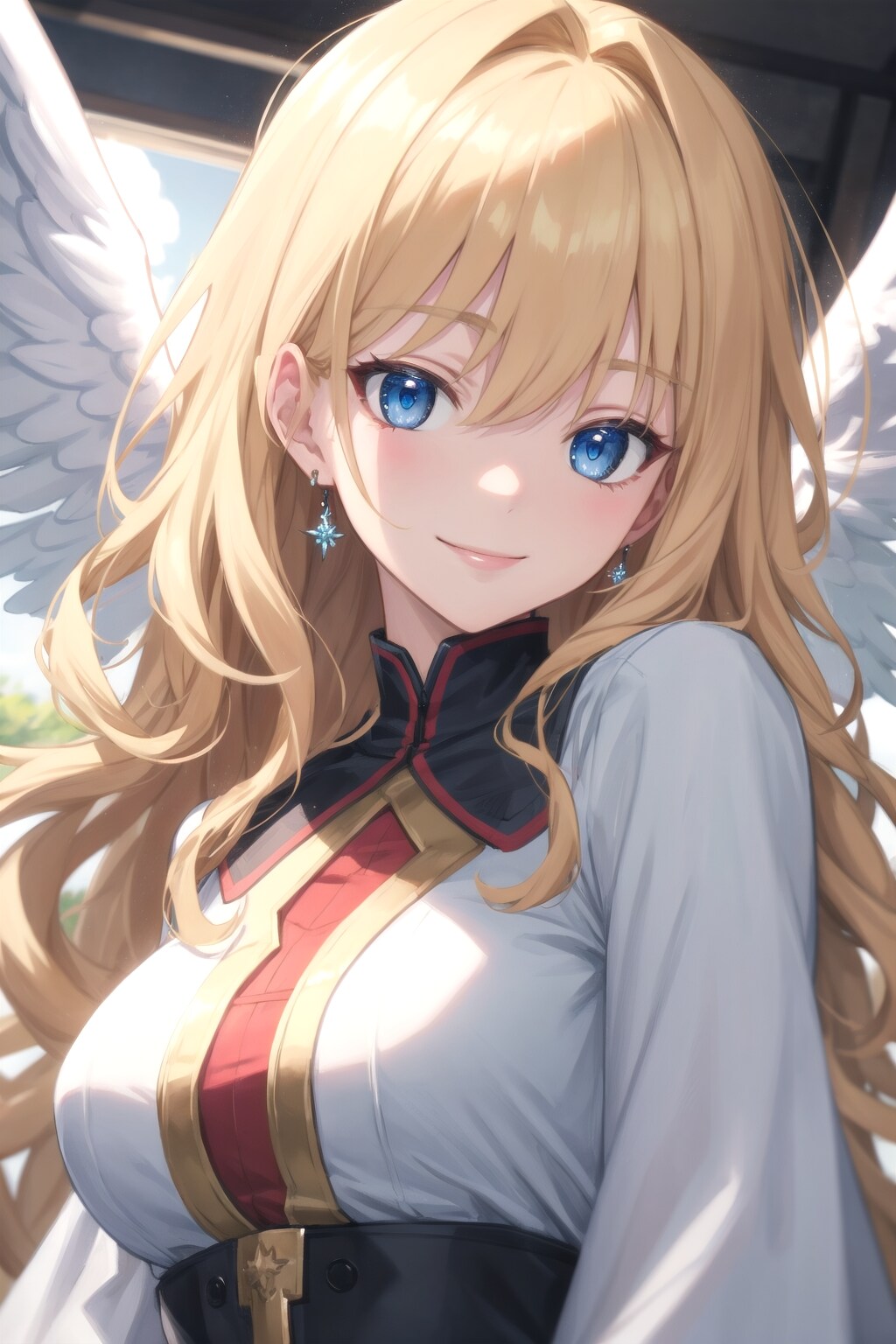 girl, long wavy hair, blonde hair, blue eyes, angel,smile,