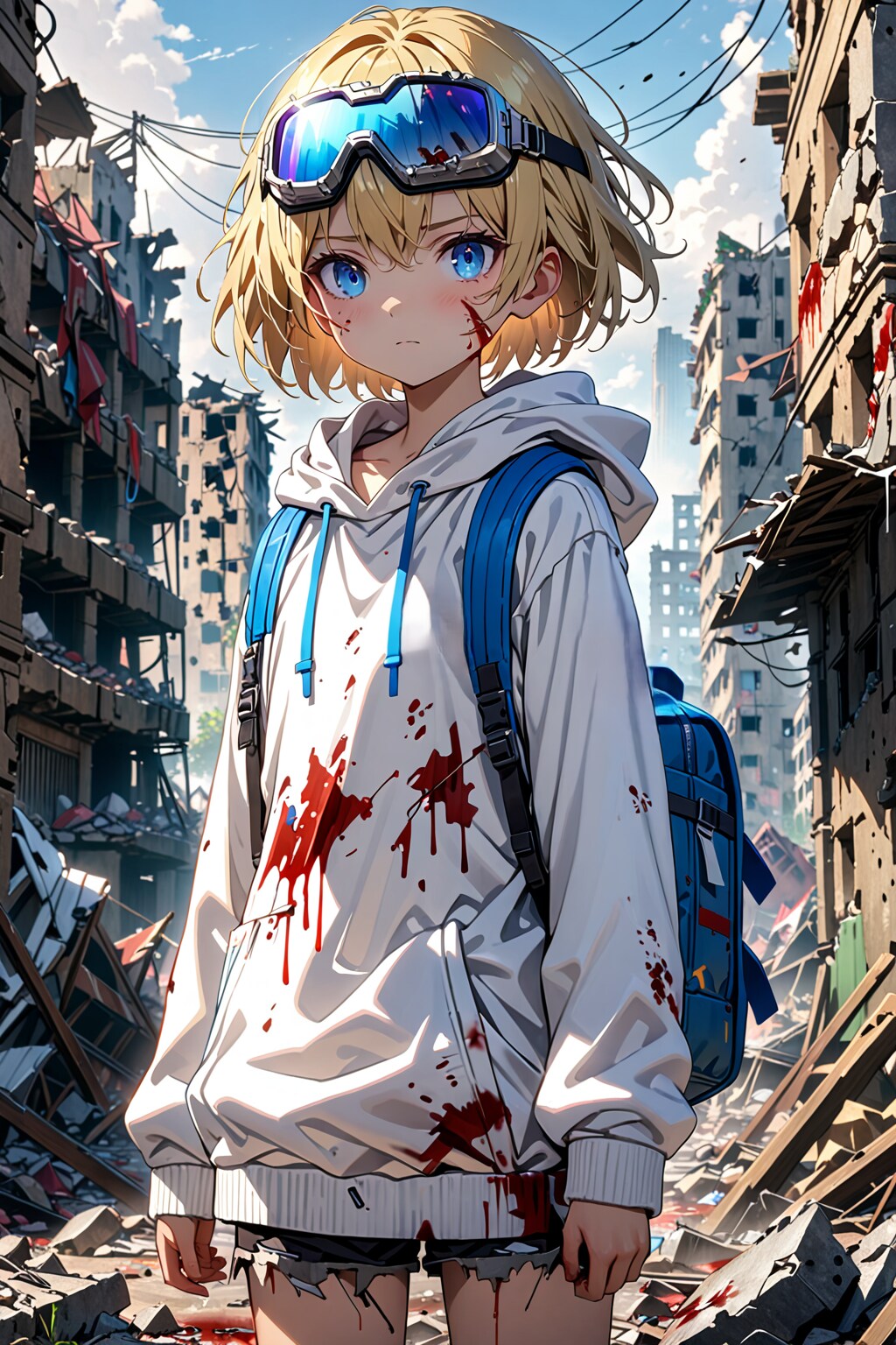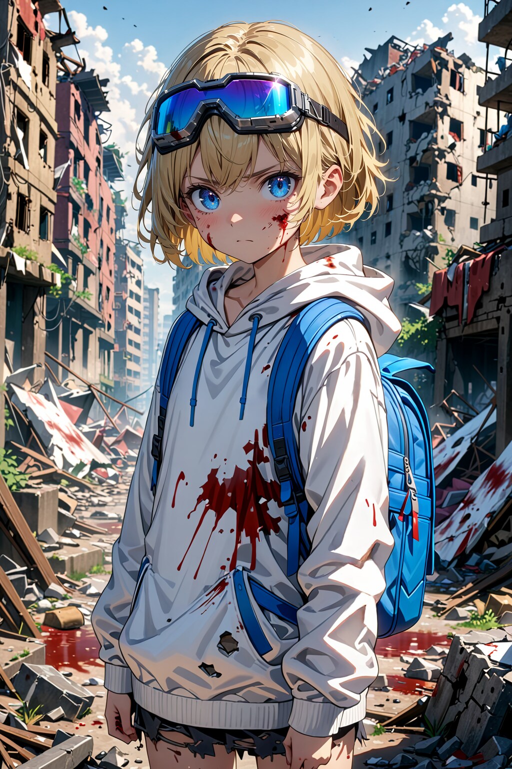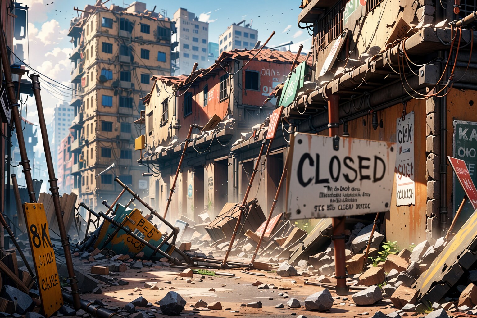 リズは、がれきの中から白塗りの鉄板を拾い上げると、なにやら殴り書きし、壊れた配管を杭にして吊るし、即席の看板をでっちあげる。