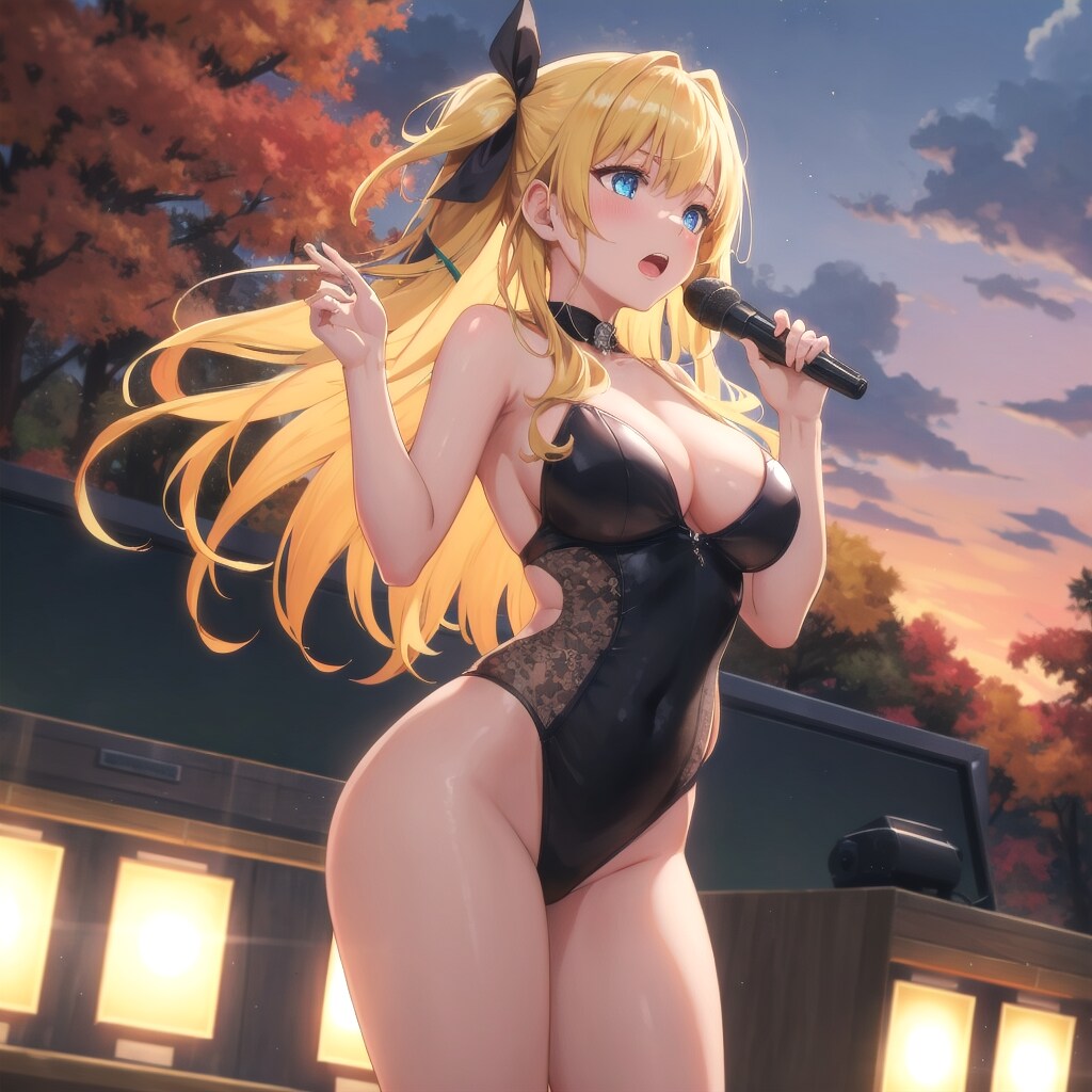 夕暮れの空を背景に、ナミちゃんの歌声が秋風に乗って広がります。自然と調和するその姿は、まるで物語のワンシーンのように幻想的でした。
