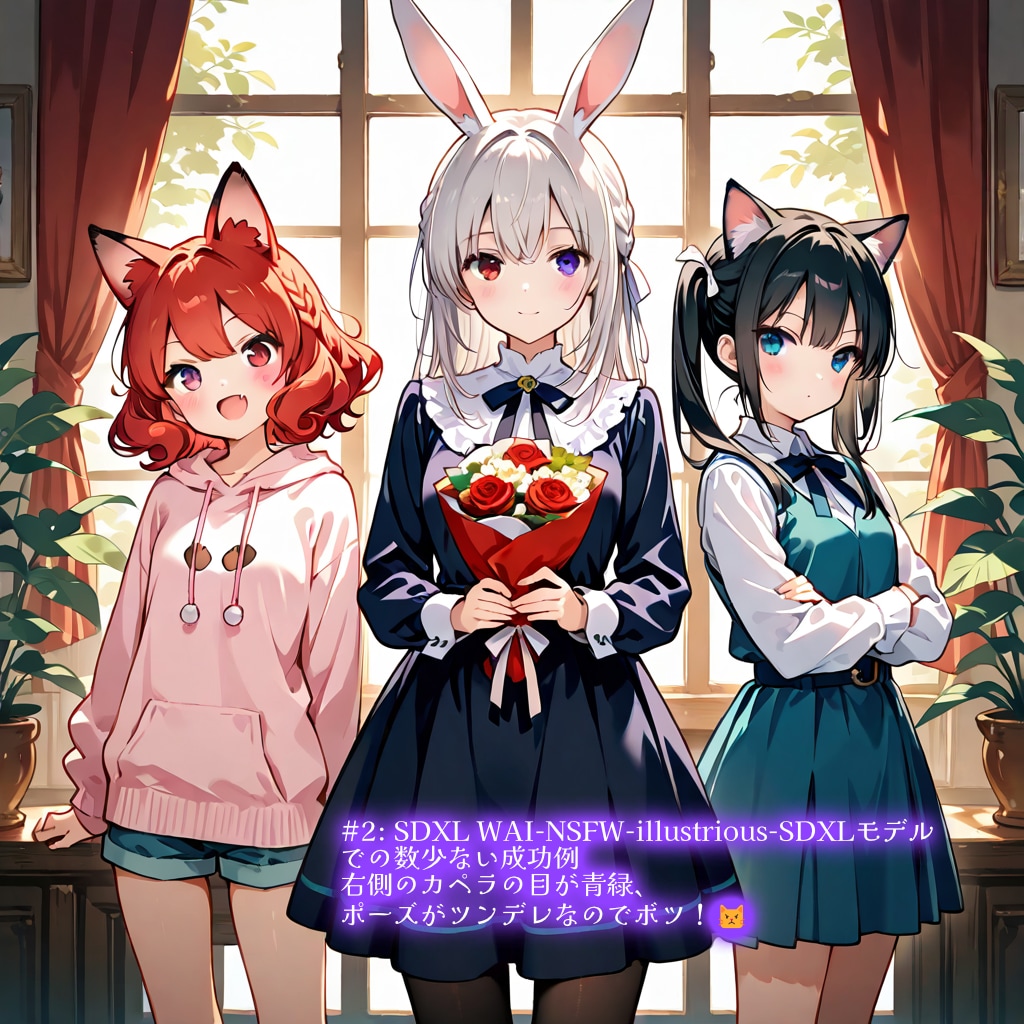 ちちぷい内で先頭を疾走する術師陣でも話題沸騰!のナウいIllustrious系(IL系)で有力なモデルです。3キャラクターの特徴がまあまあ再現できていますが...中央のエリアーヌがオッドアイに。右端の猫娘カペラの目も設定では紫のところ服の色が波及して青緑になっちゃいました。目の色ぐらいは編集でも治せますが....カペラの腕を組んだツンデレポーズがよくありません。ツンデレなのはカペラさんでなくて元ネタのブ◎アカのセリカちゃんのほうなんや!( ;∀;)