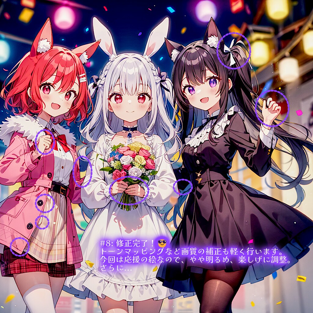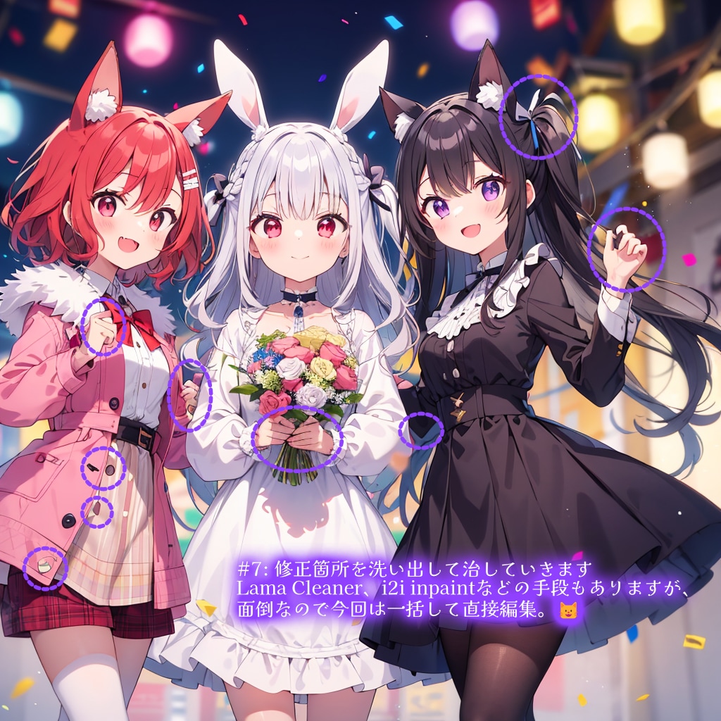 この絵では右側の猫娘カペラのところです。仮にツインテを絞るリボンが破綻していても修正は容易です。しかし脚のタイツが白なのをすべて黒に治すのはちょっと大変です。(i2iのinpaint等を使う手もあります) 彼女は旅する黒猫のイメージなので、せっかく黒系のワンピースなので脚も黒で色合いを統一したいところです。