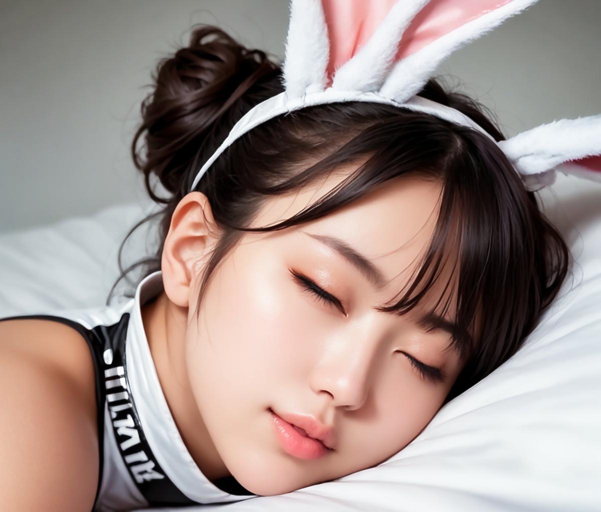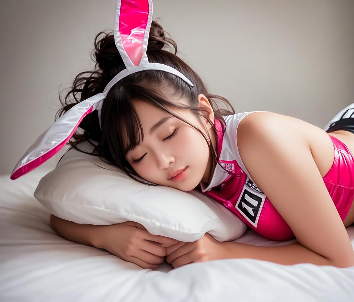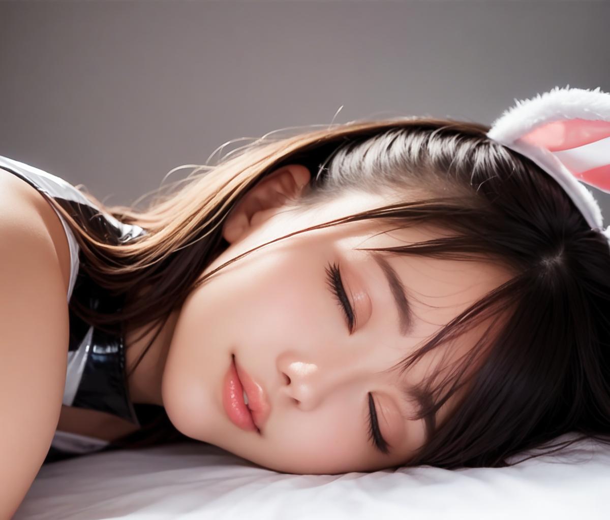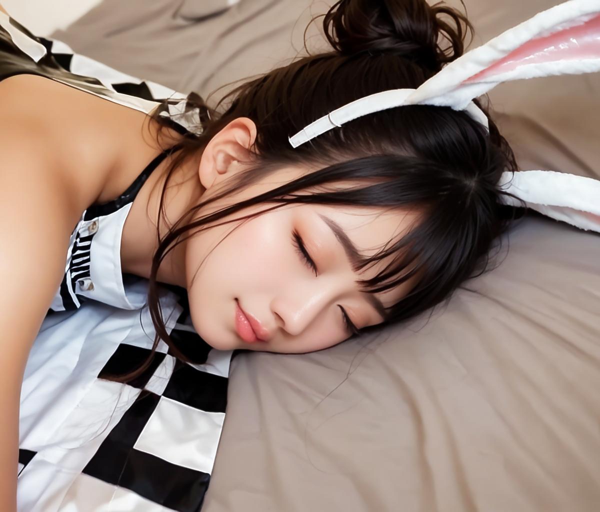 激しいプレイの連続で、疲れ切ってメイクも落とさず眠ってしまったウサギさんです。