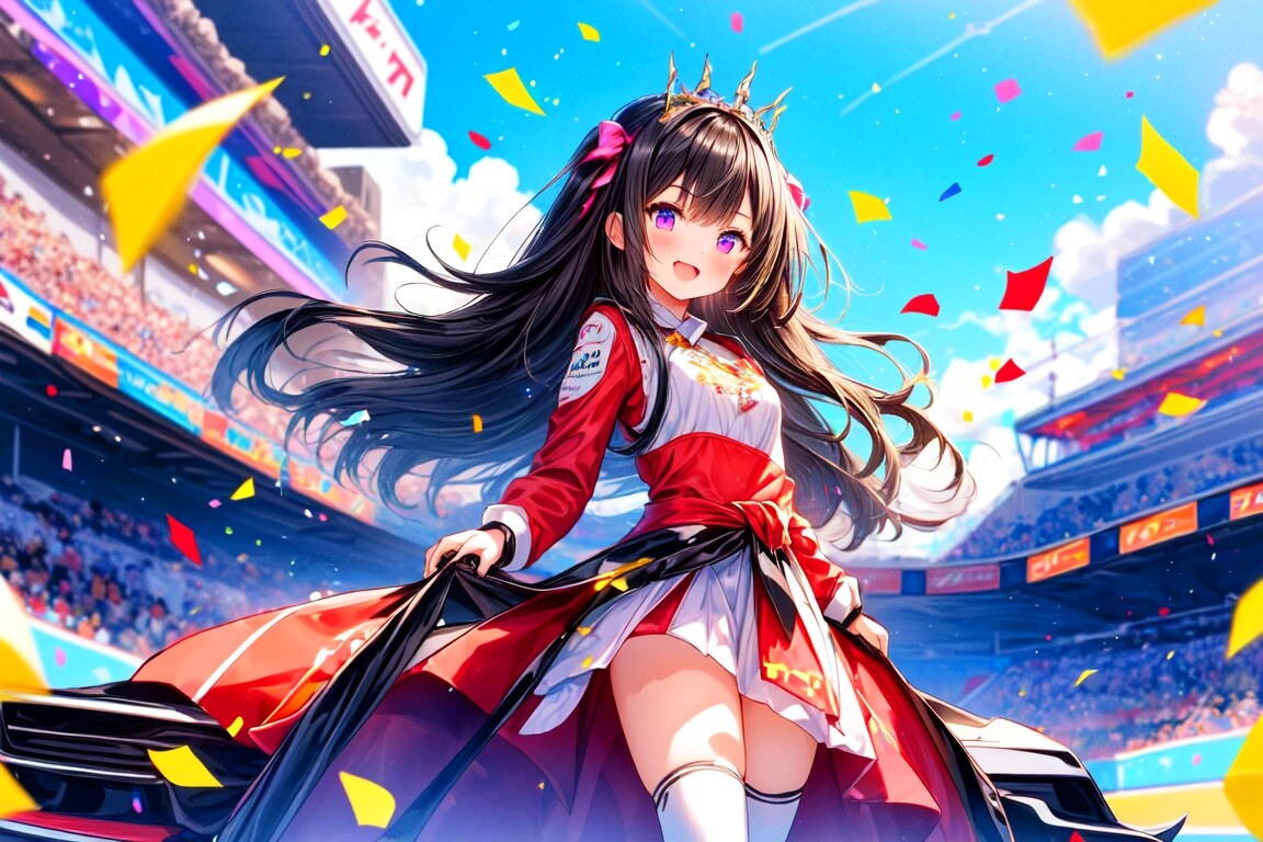 結果、レースクイーンっぽい衣装を着たうちの子が出てよかったです。サーキットのにぎやかな雰囲気も伝わってきていい感じです。紙吹雪も散らしてみました!!