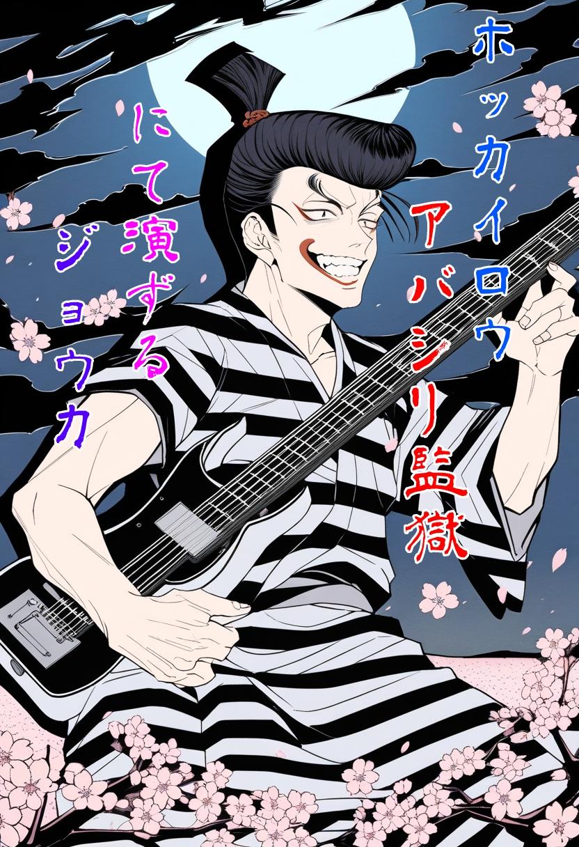 Kabuki,topknot,heavy makeup,crazy smile,prison clothes,playing electronic guitar,crazy atmospheres,