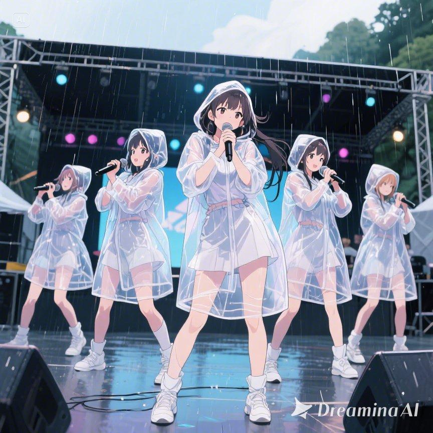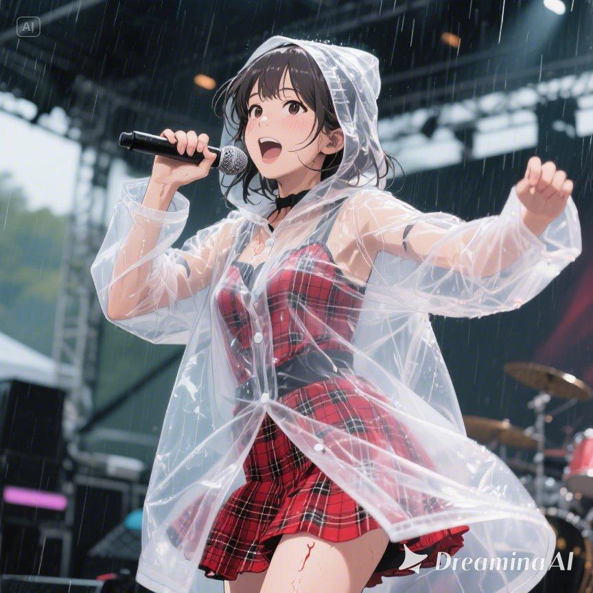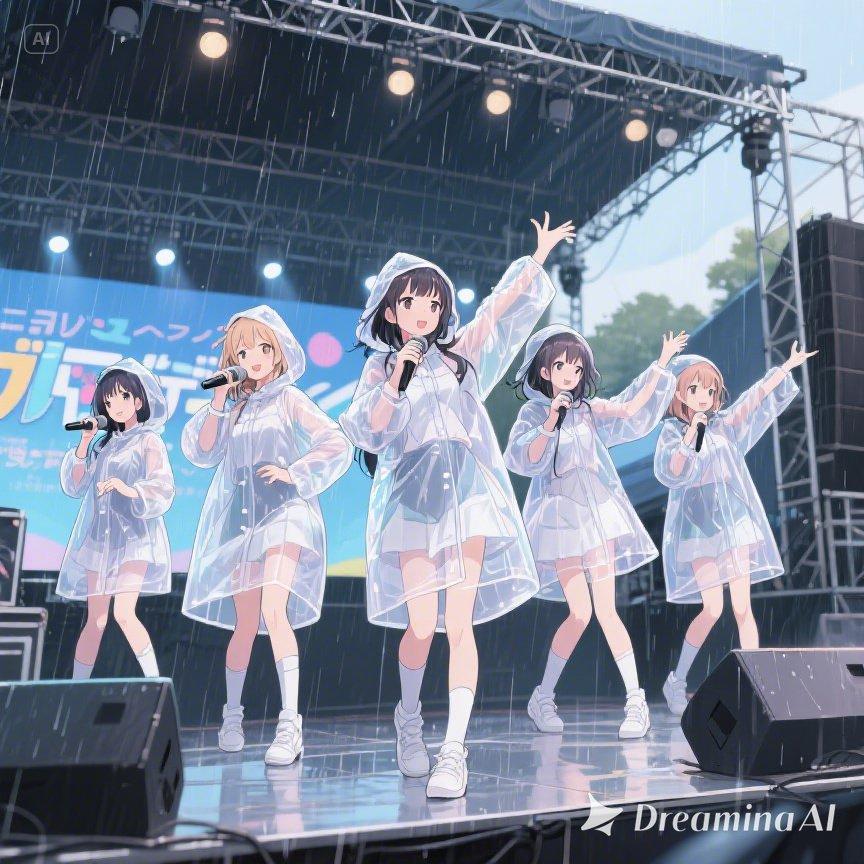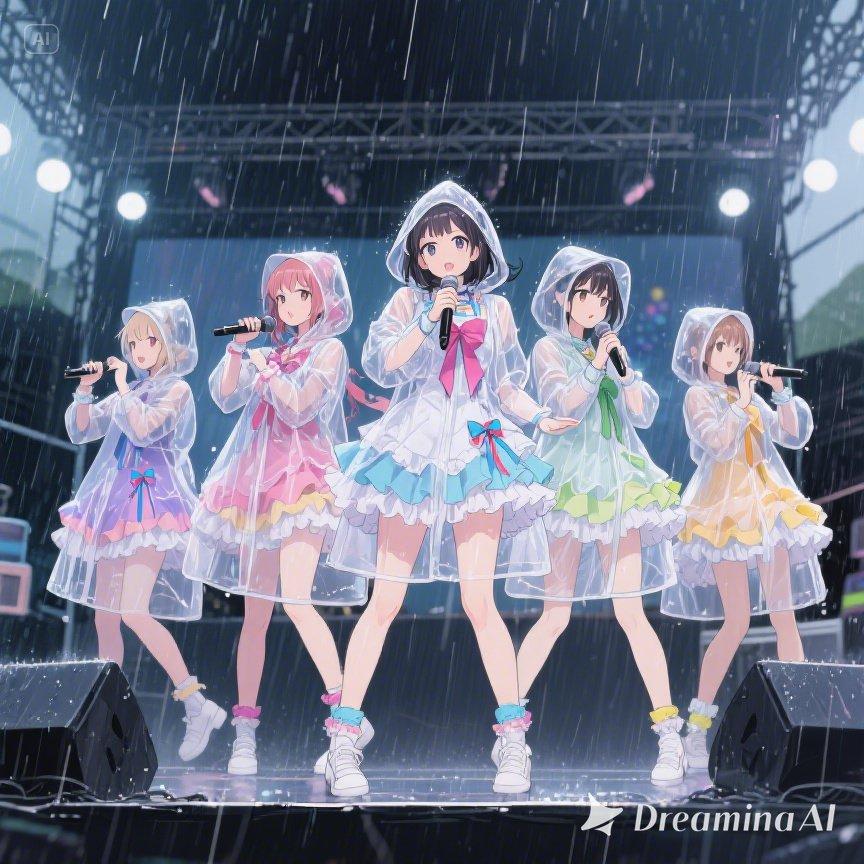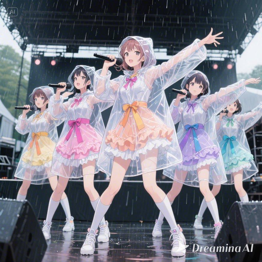 雨天決行の野外ライブで、カッパを着て歌い踊るアイドルです。