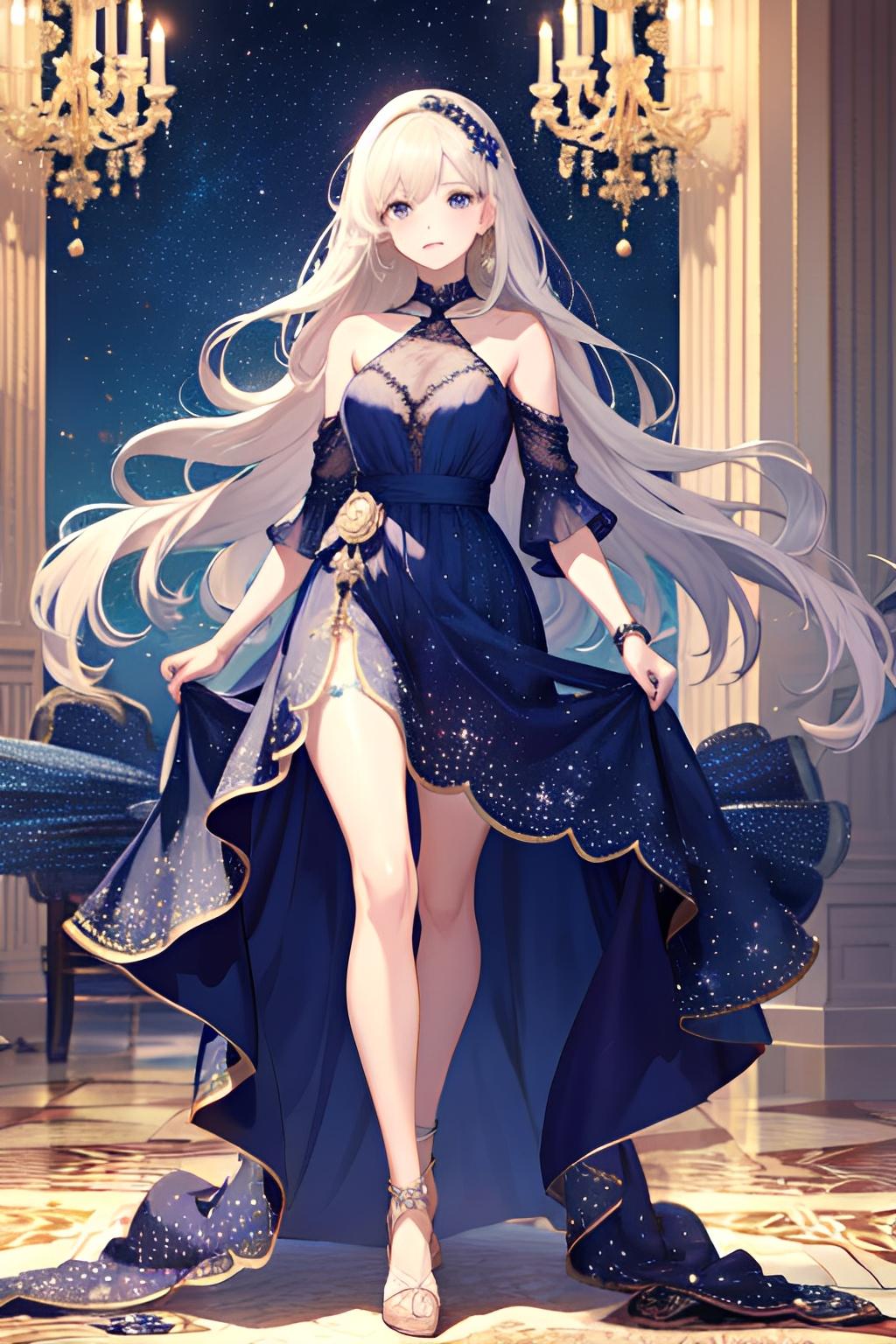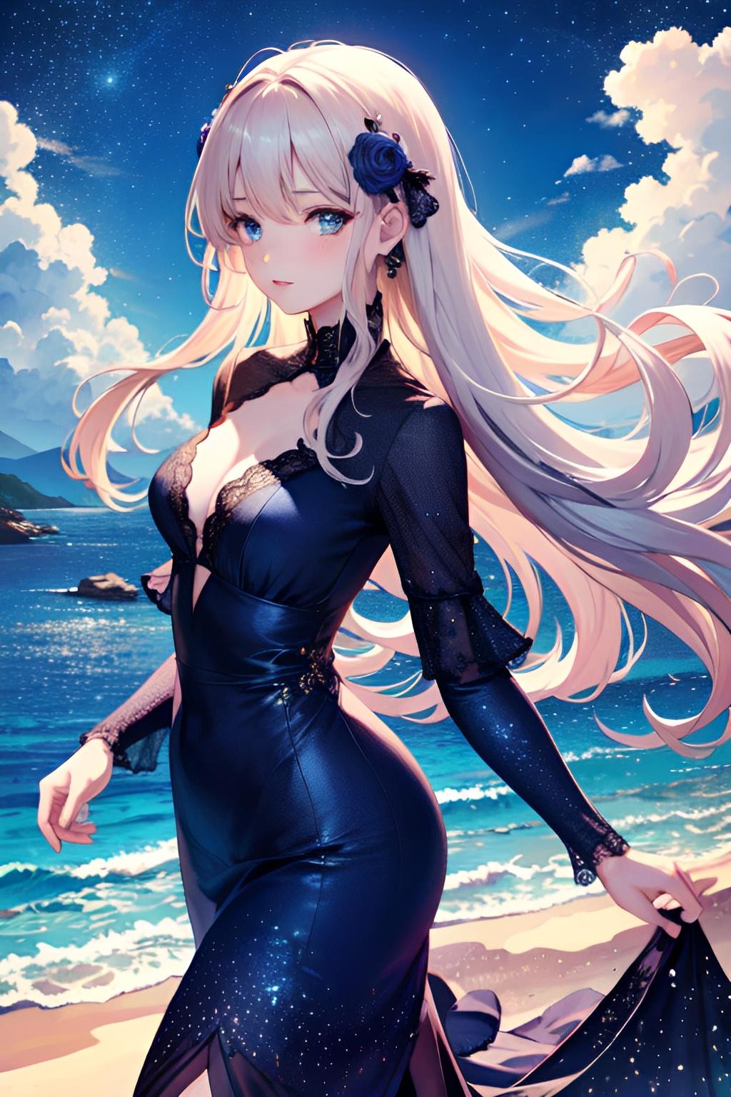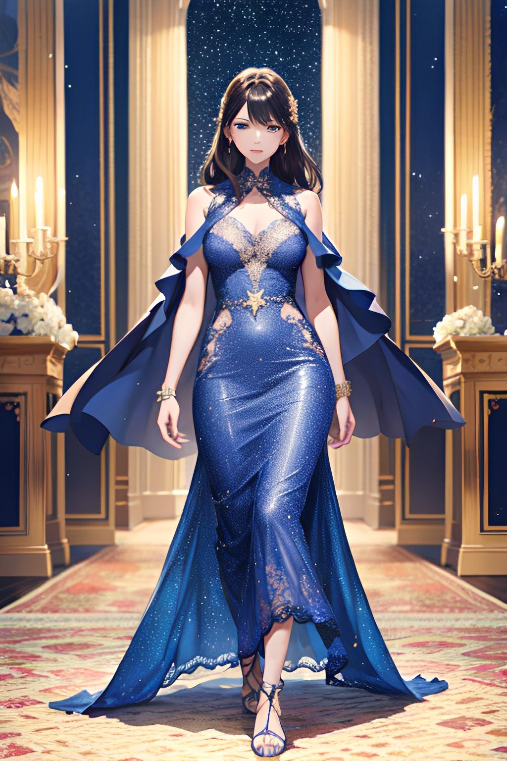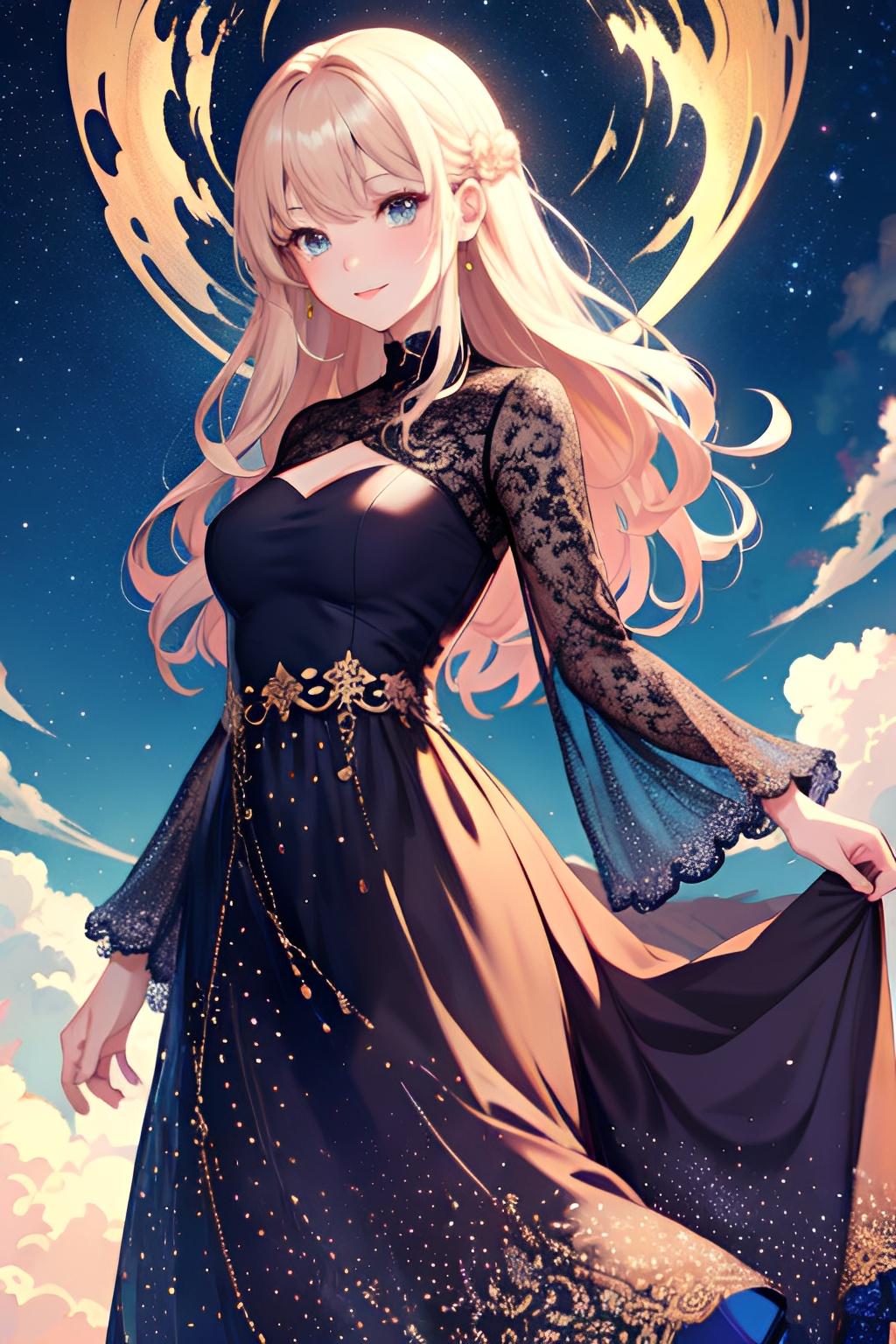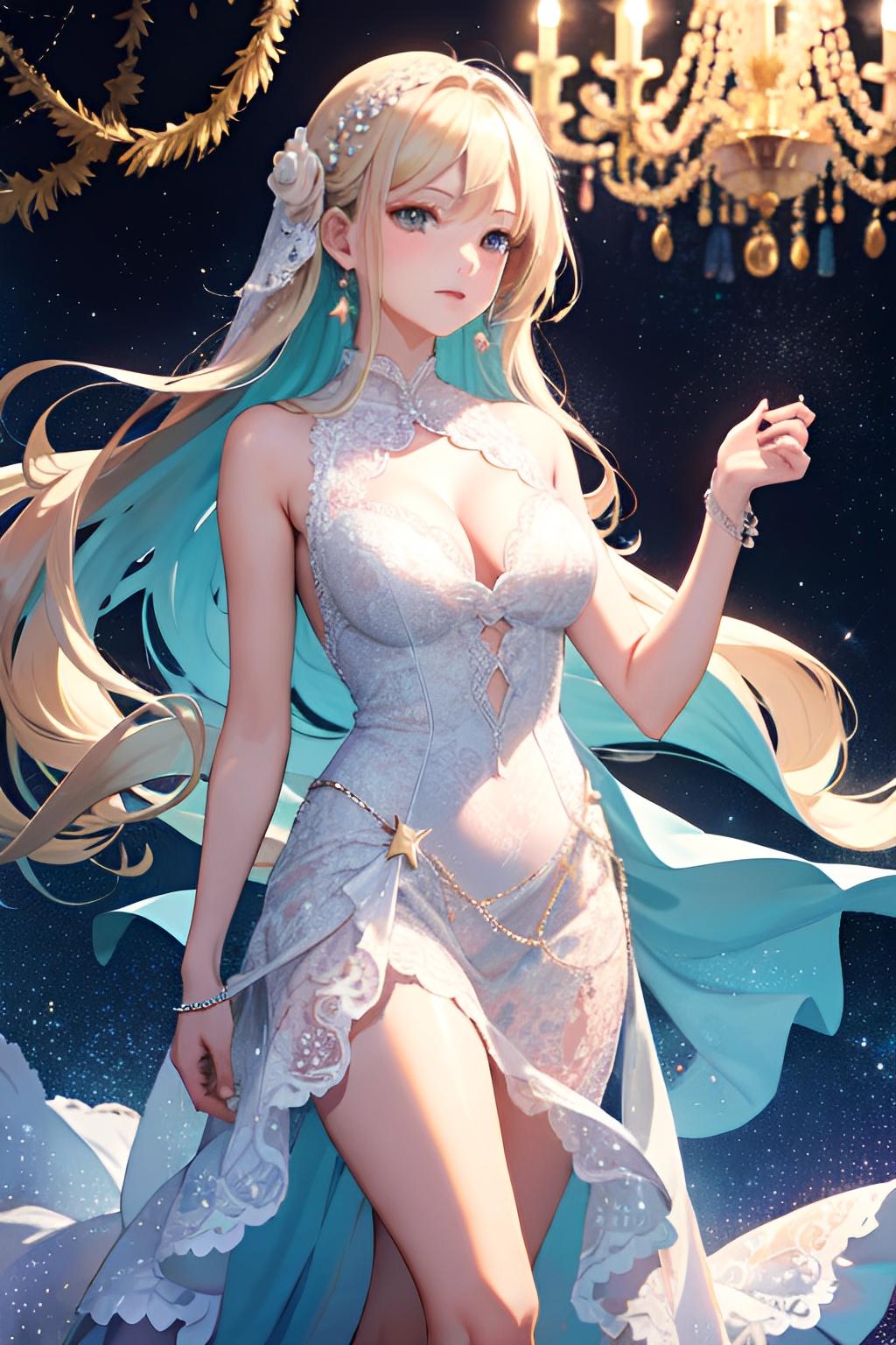 スカートの裾に星空の模様や波の形状を施し、レースの儚げな神秘感と相まって、ヘアアクセサリーやブレスレット、ネックレス、さまざまな装飾品の華やかさも加わり……女性の体の曲線も素晴らしく表現されています……