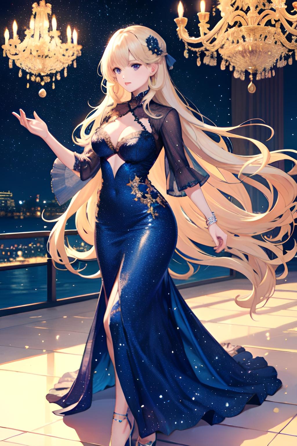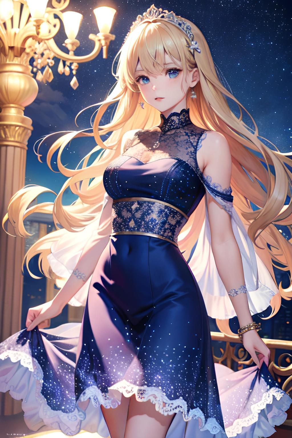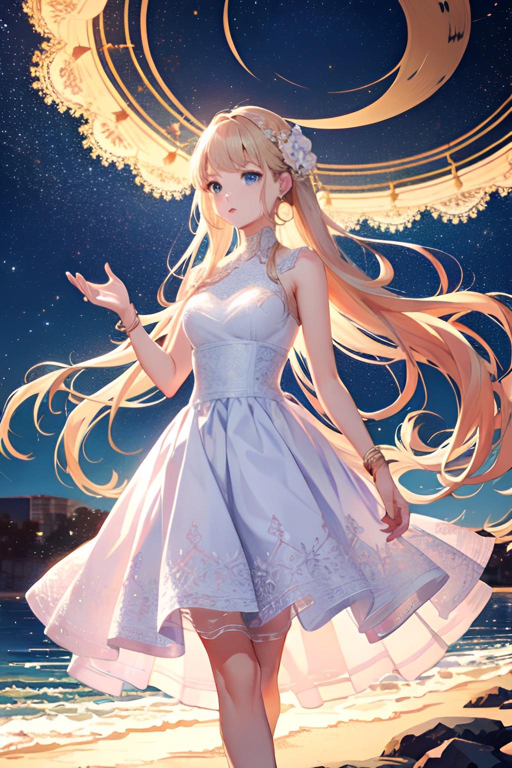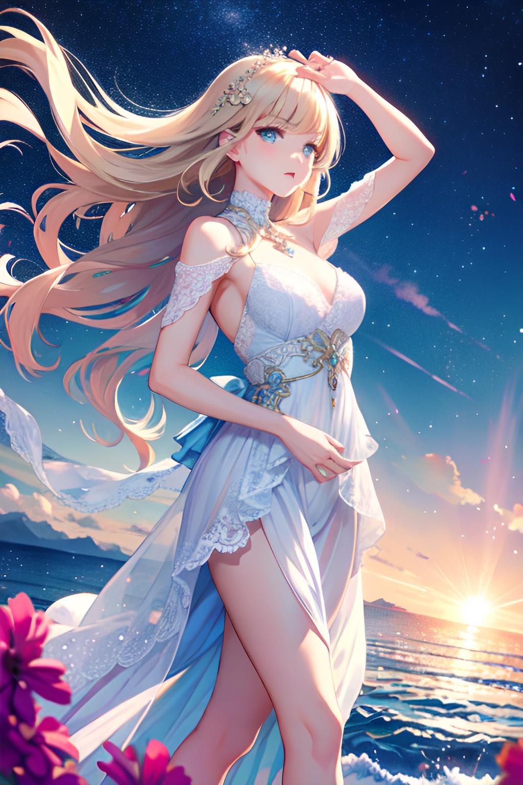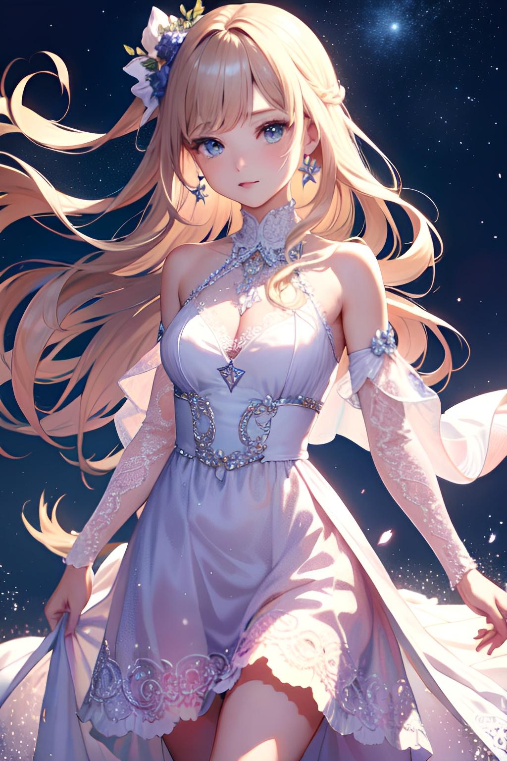 スカートの裾に星空の模様や波の形状を施し、レースの儚げな神秘感と相まって、ヘアアクセサリーやブレスレット、ネックレス、さまざまな装飾品の華やかさも加わり……女性の体の曲線も素晴らしく表現されています……