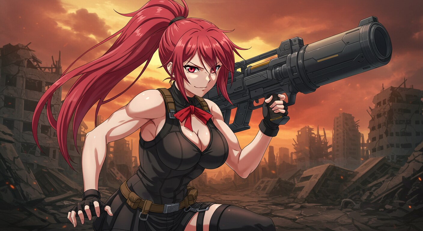 Anime style, girl riding bike, abandoned city, bike explodes