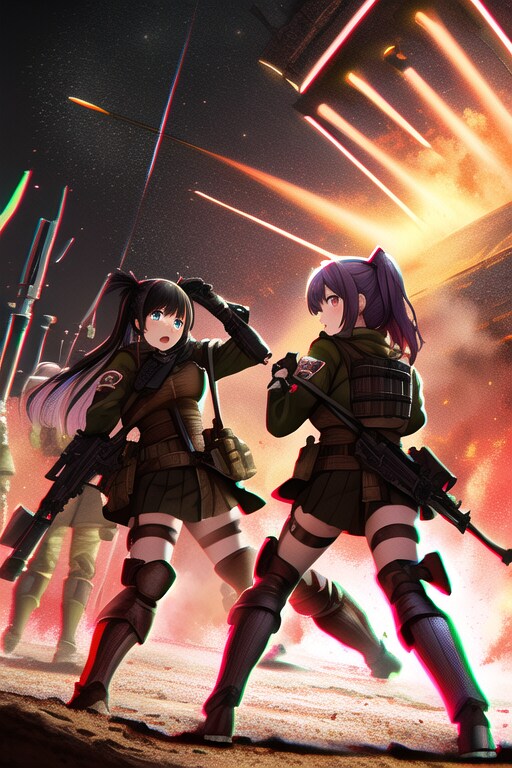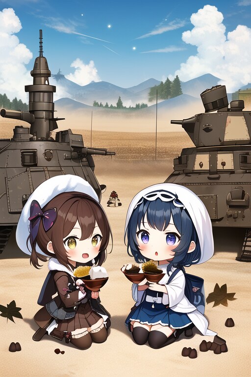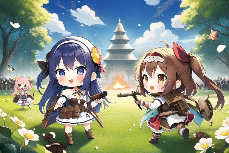 {{illustration}}, {{ultra-detailed}}, {{chromatic aberration}}, {{caustic}}, 2girls,{kawaii},full body,War of Chocorooms and Chococones,Battle Scene
