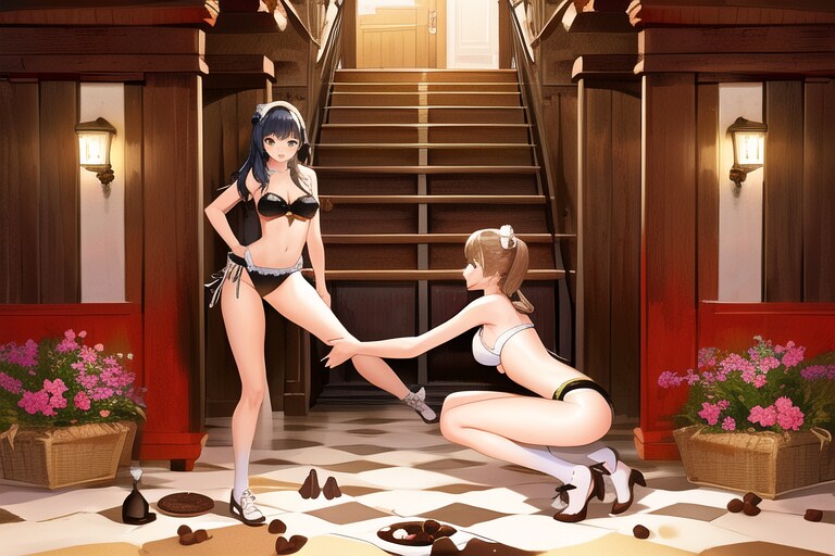 {{illustration}}, 2girls, full body, Chocorooms and Chococones are fighting