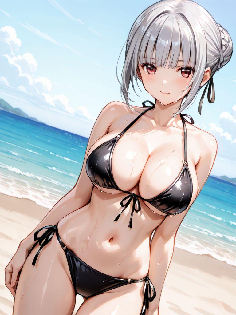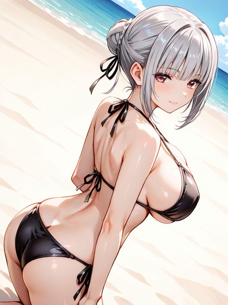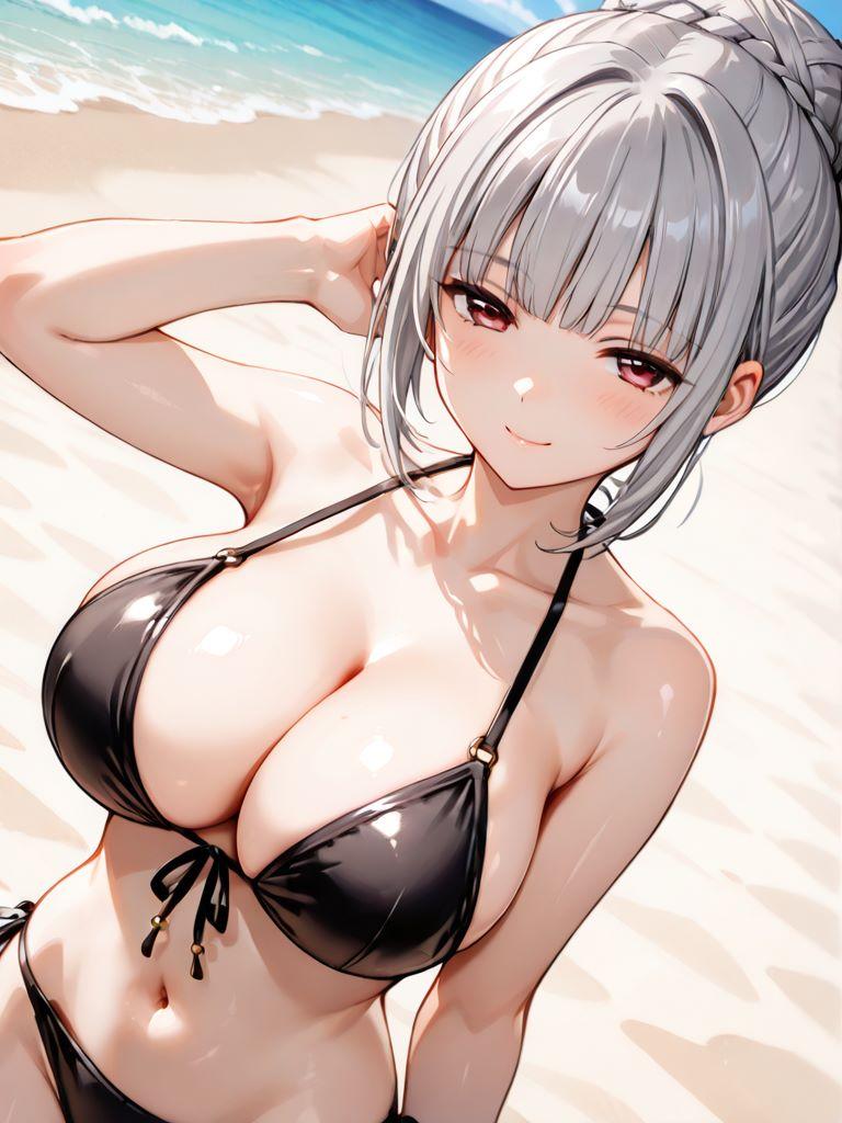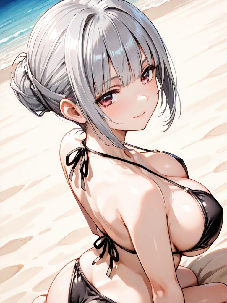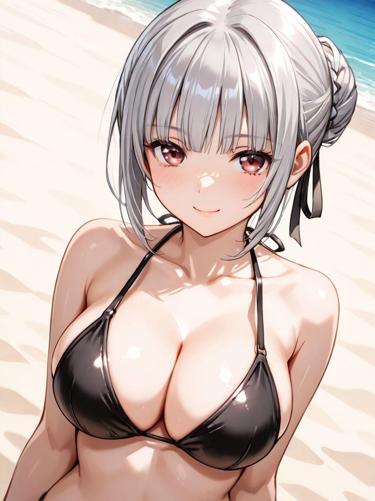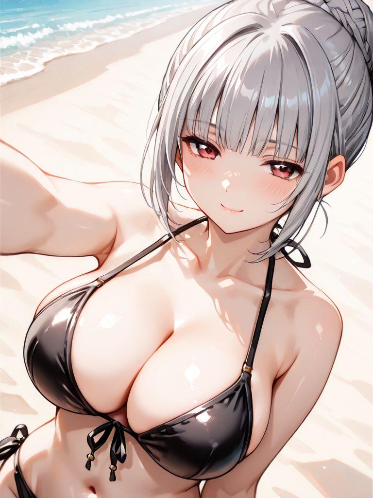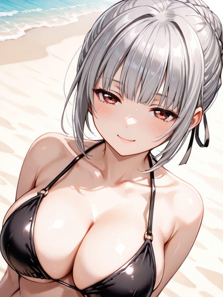 銀髪巨乳メイドと浜辺で。そわそわしているので何かと思ったら、膝枕をしたかったようだ。