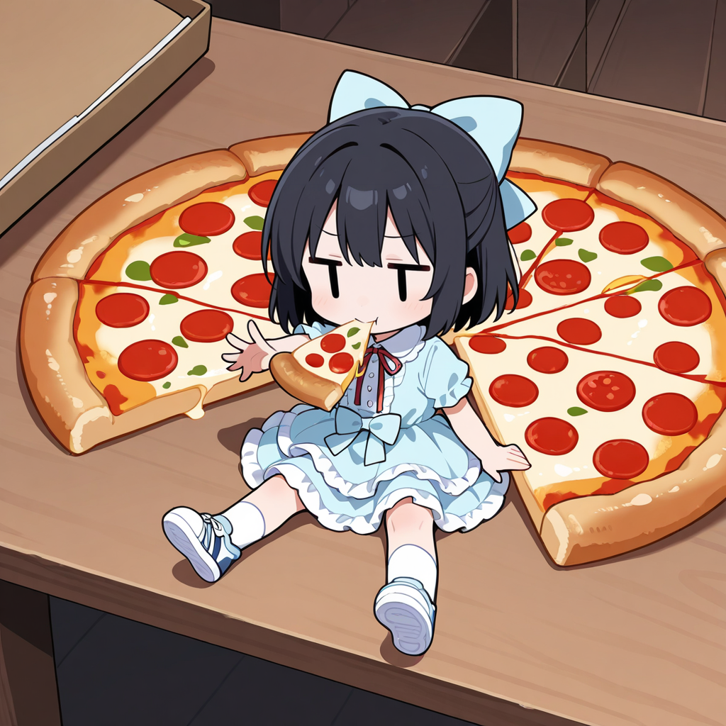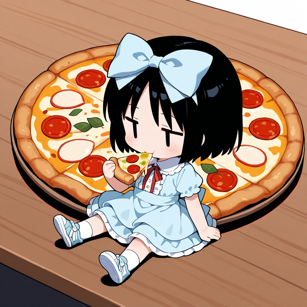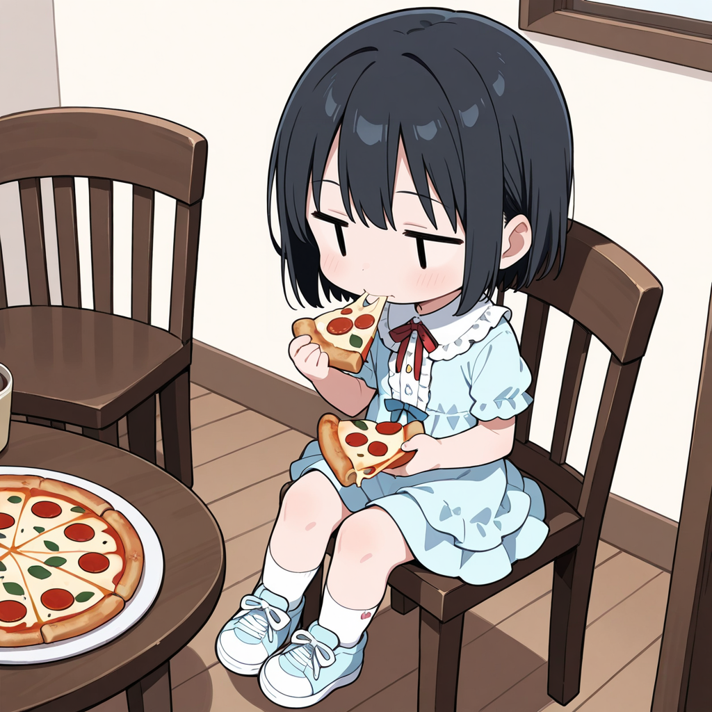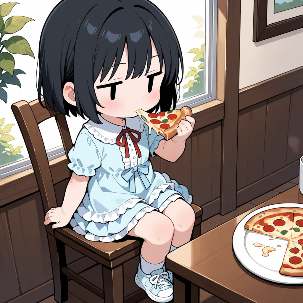 テーブルの上に乗っているのがはしたないので、椅子に座らせたら普通の絵になってしまいました。
