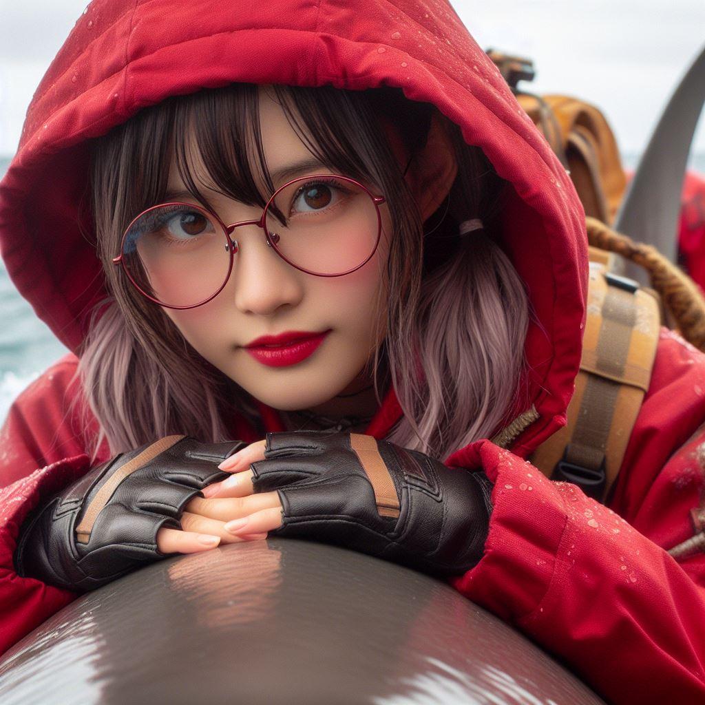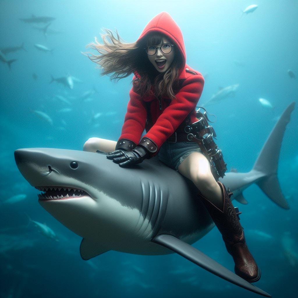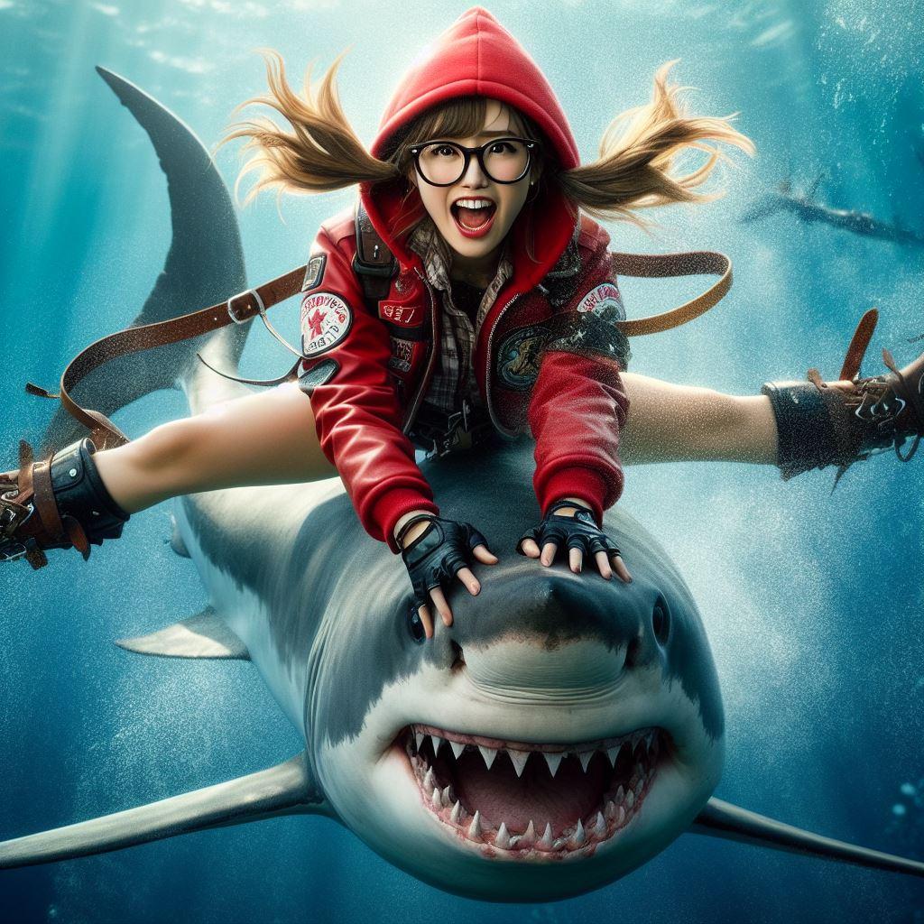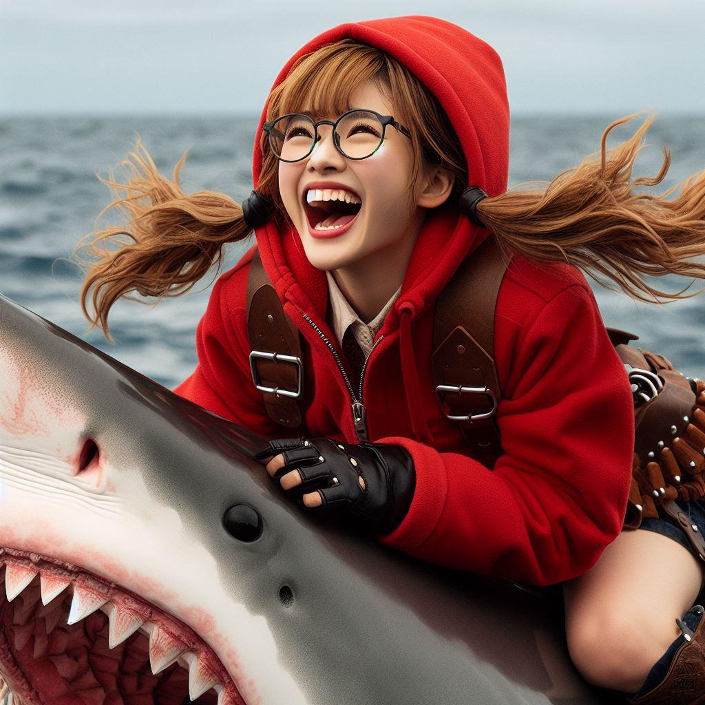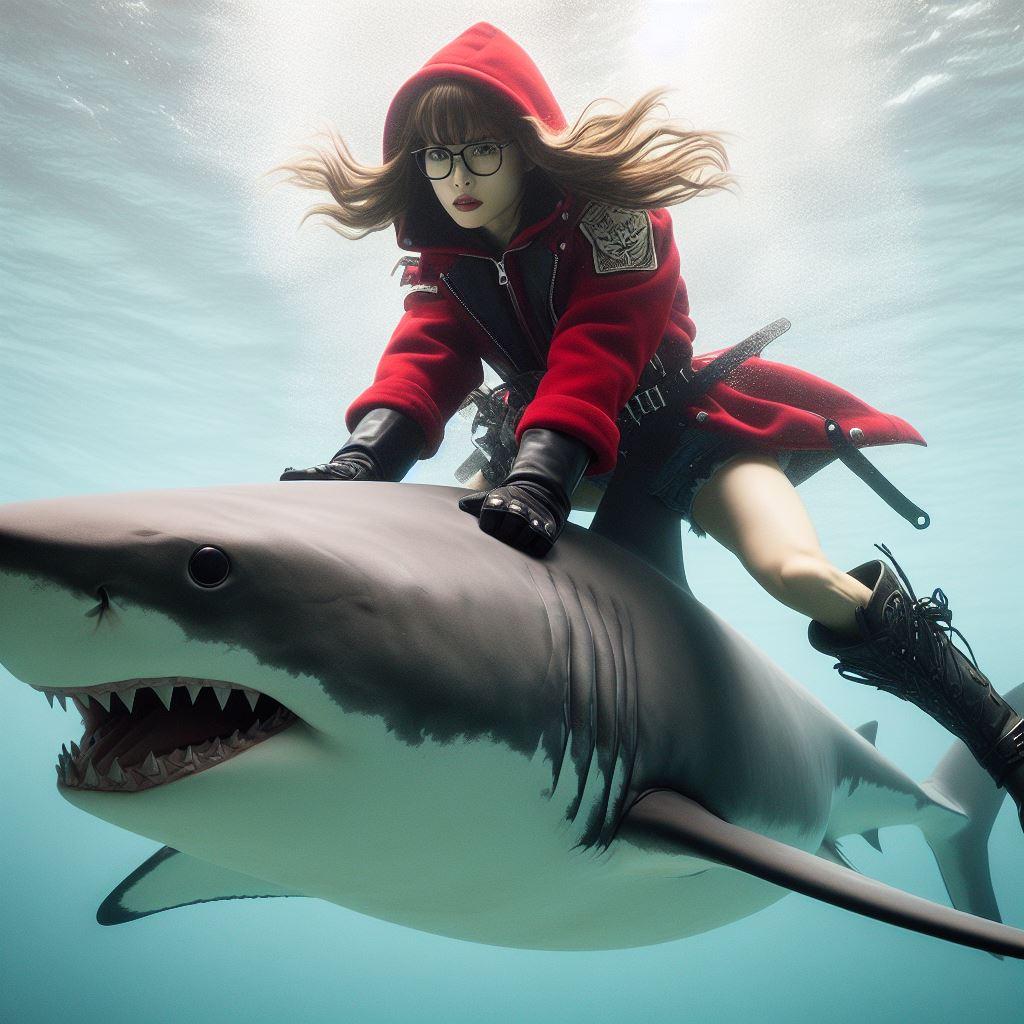 すっかり大人しくなったホオジロザメを嬉々として乗りこなす赤ずきんちゃん(1枚目、4-10枚目)