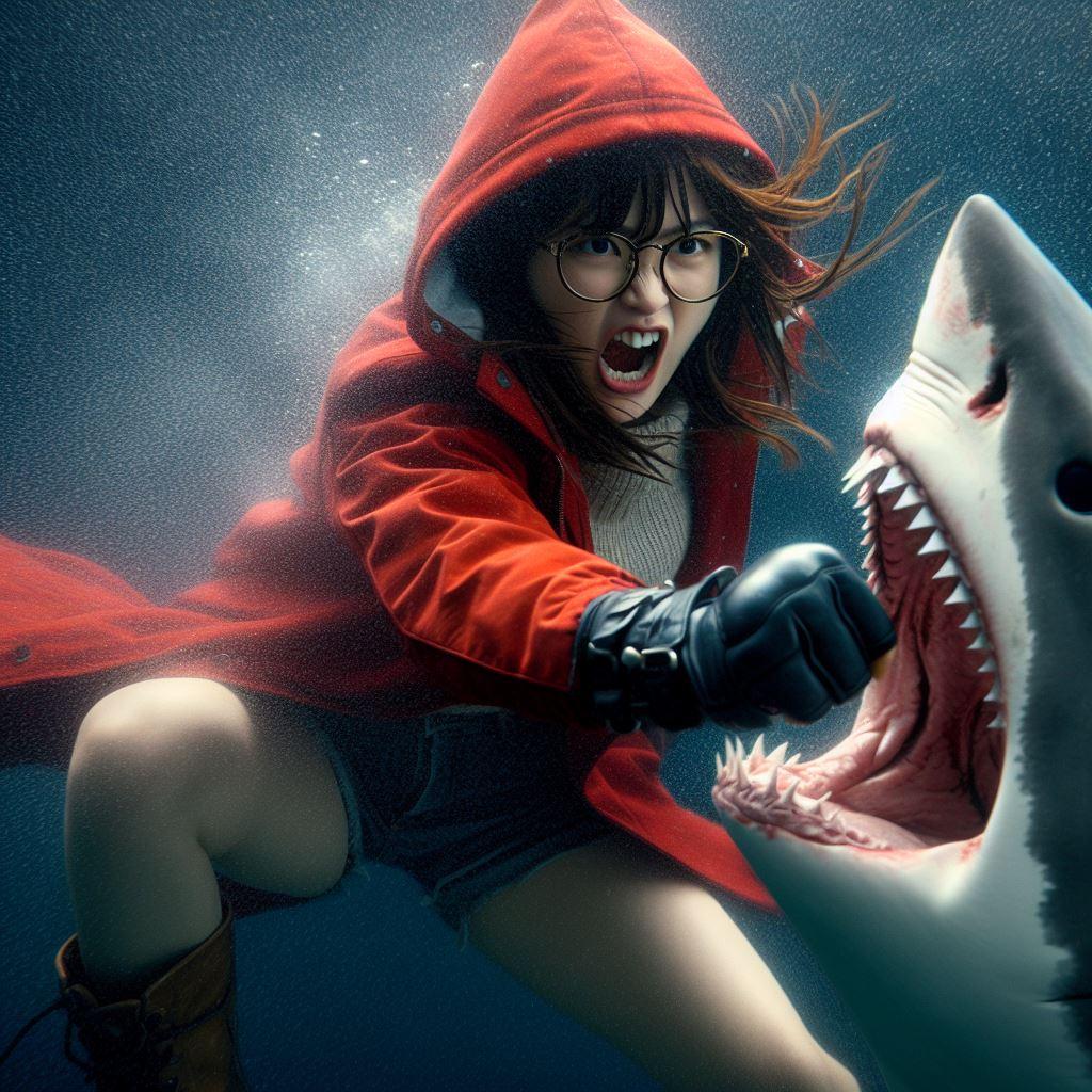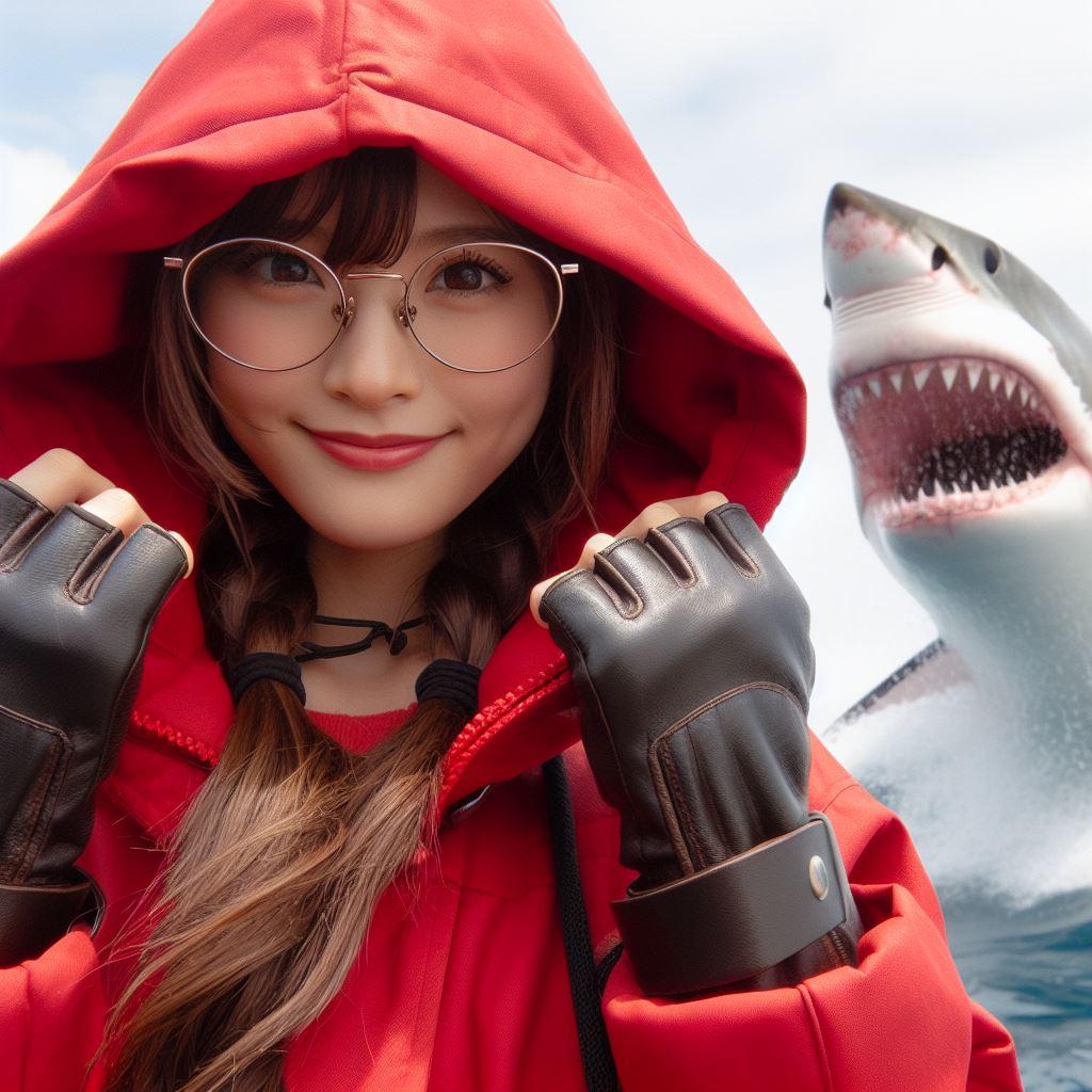バラエティ番組の企画でホオジロザメと遊ぶことになった赤ずきんちゃん(2枚目)