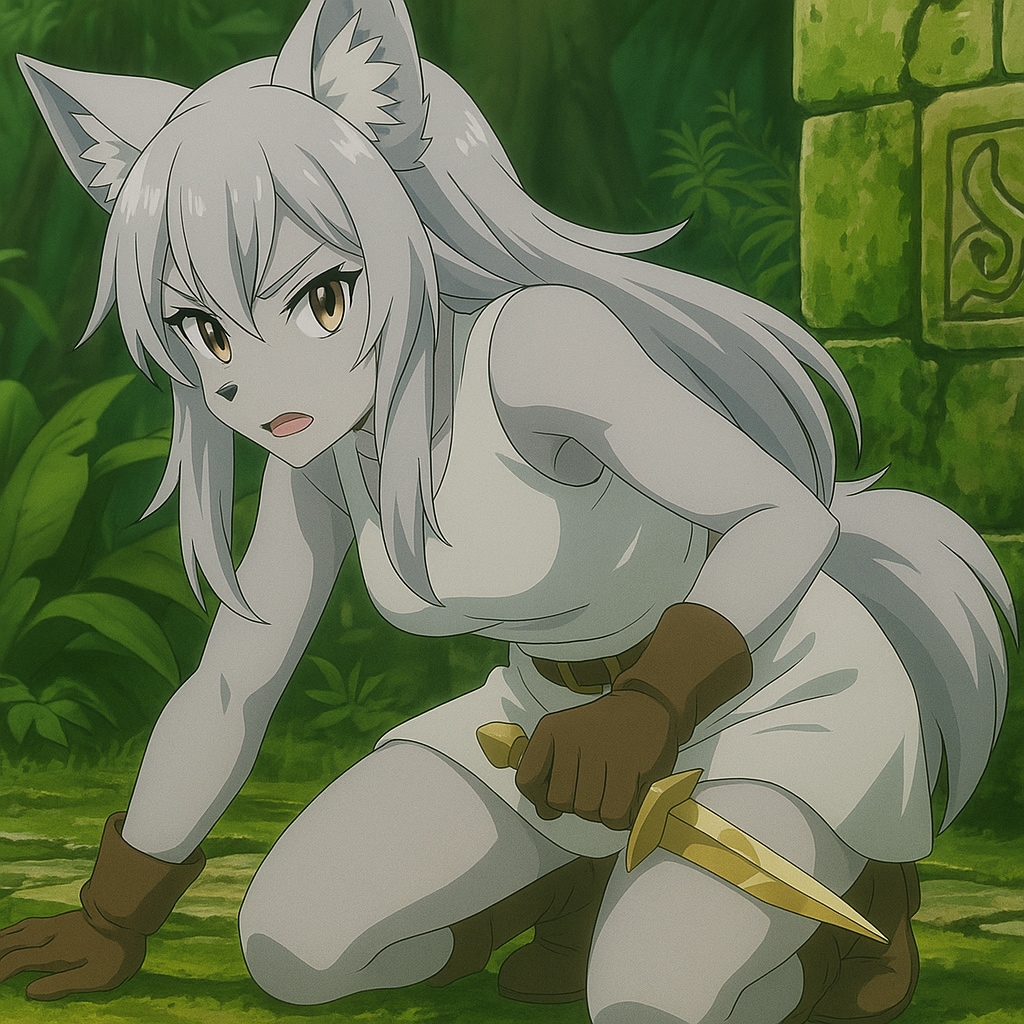 古代遺跡で状態がやたら良い青銅の短剣を発見したケモノ系女子、探索する気がない薄着装備…ケモノだからこれで大丈夫なのである。
