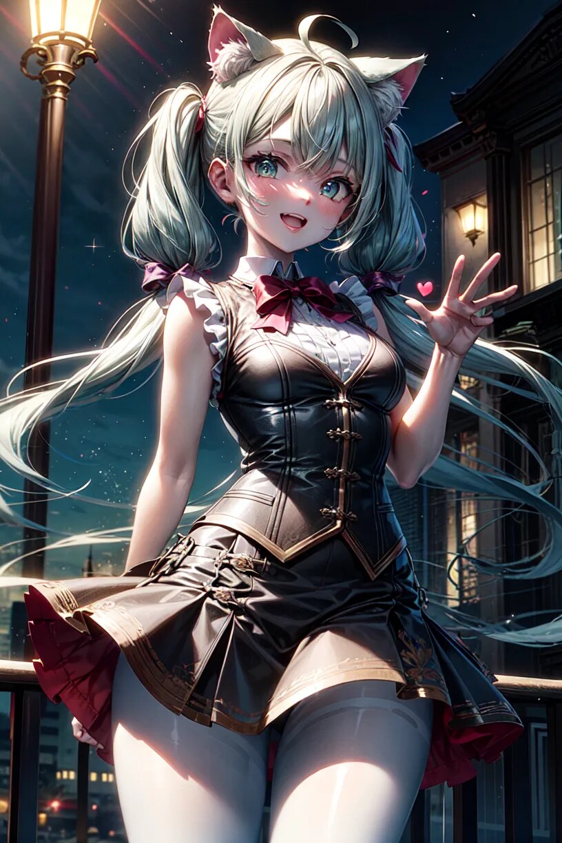 「こっち、こっち~!夜めっちゃ綺麗だね!」 夜景と水色髪の猫耳ちゃん