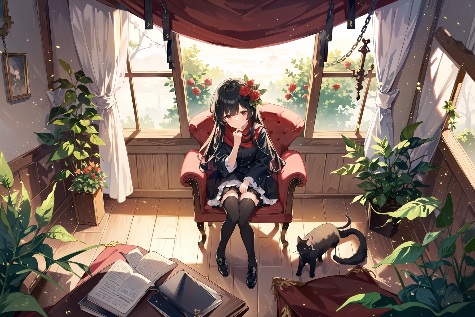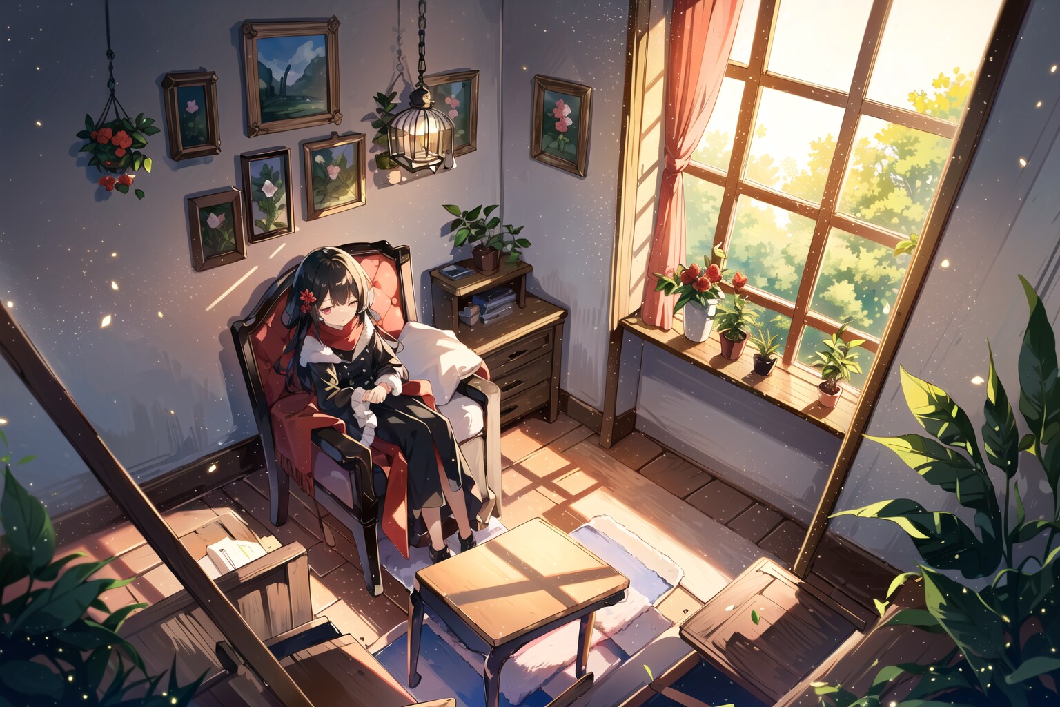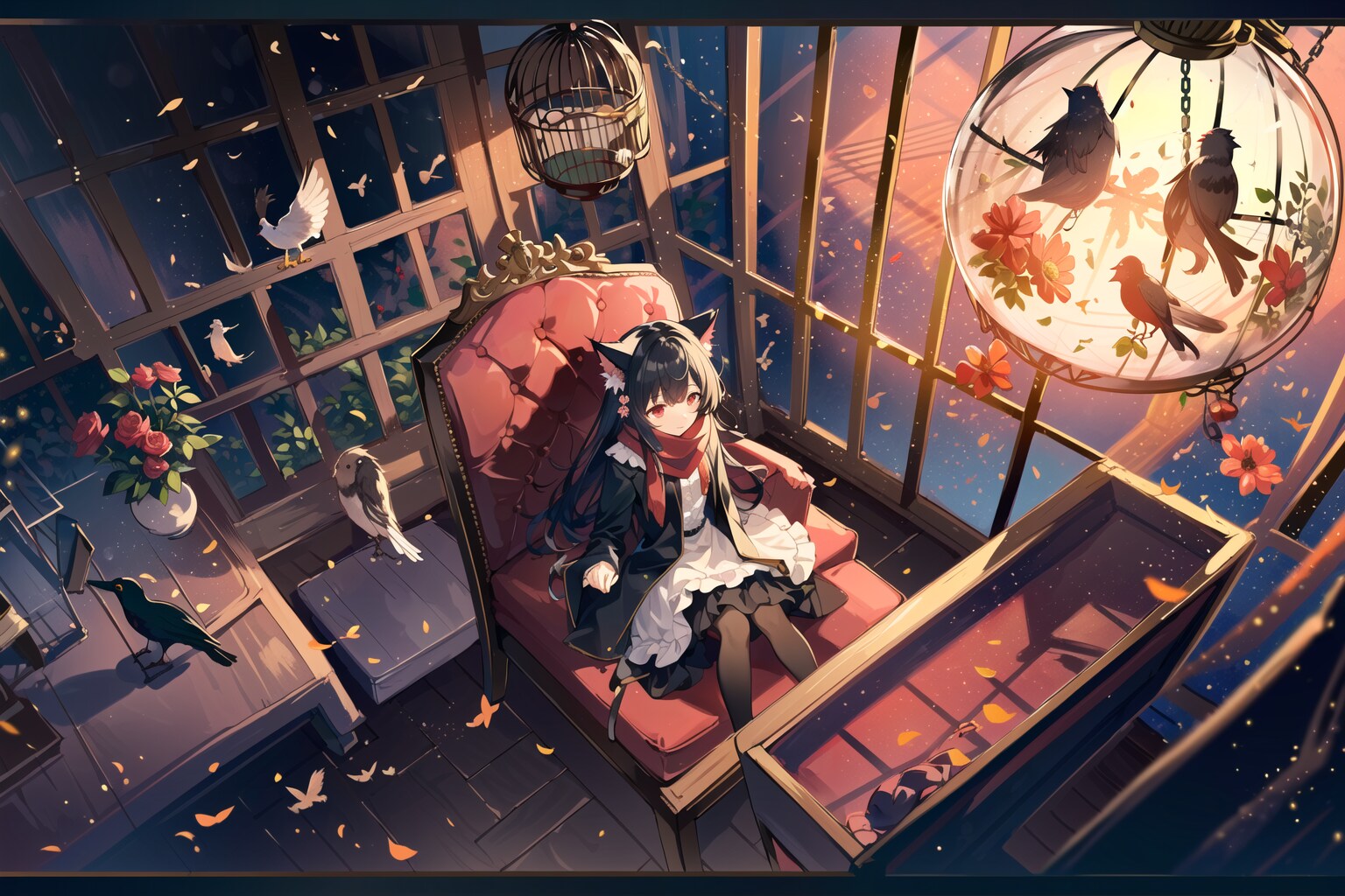 (bird, bird in birdcage:1.6), (silhouette of bird:1.2), (in the messy room:1.3),(cute interior:1.5),(pink room),window,kawaii room,canopy,frills,pink chair,(baldachin:1.2),(Foliage plant:1.2),(chesterfield chair:1.5), sunlight from window