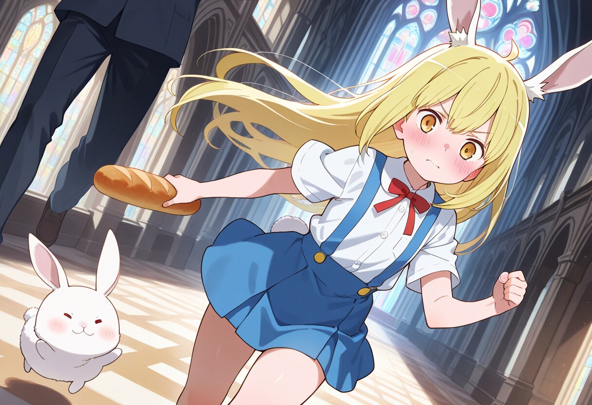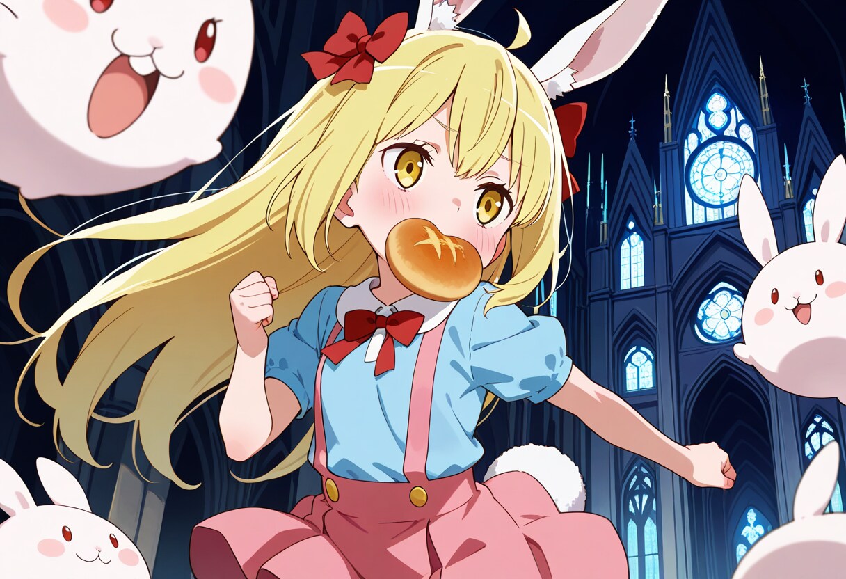 本当は、白兎がパンを咥えていて欲しいのですが、どうしても、キャラクターの方が咥えてます。
