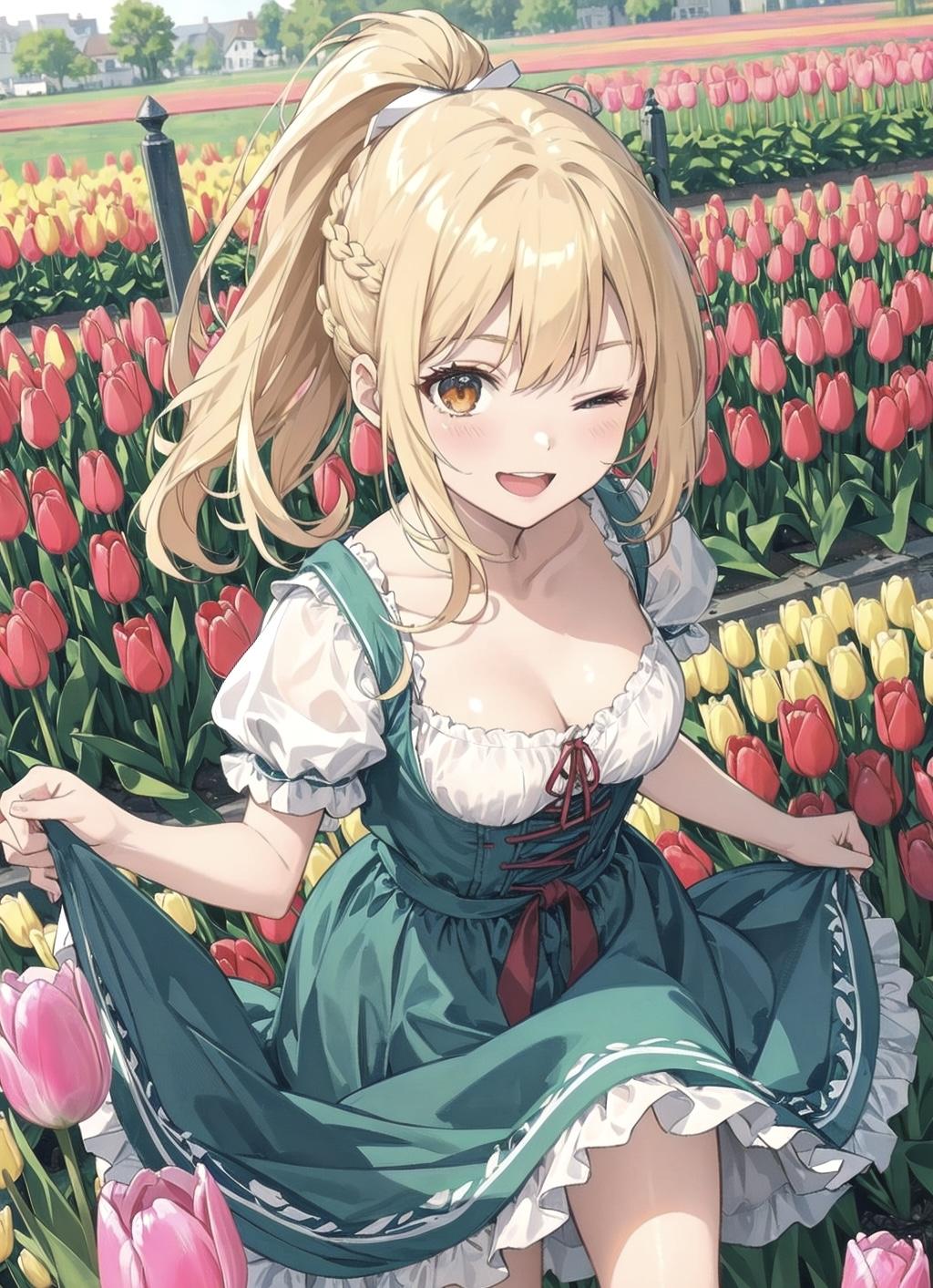 ディアンドルコスが出来るチューリップ園ではしゃぐうちのお嬢さま