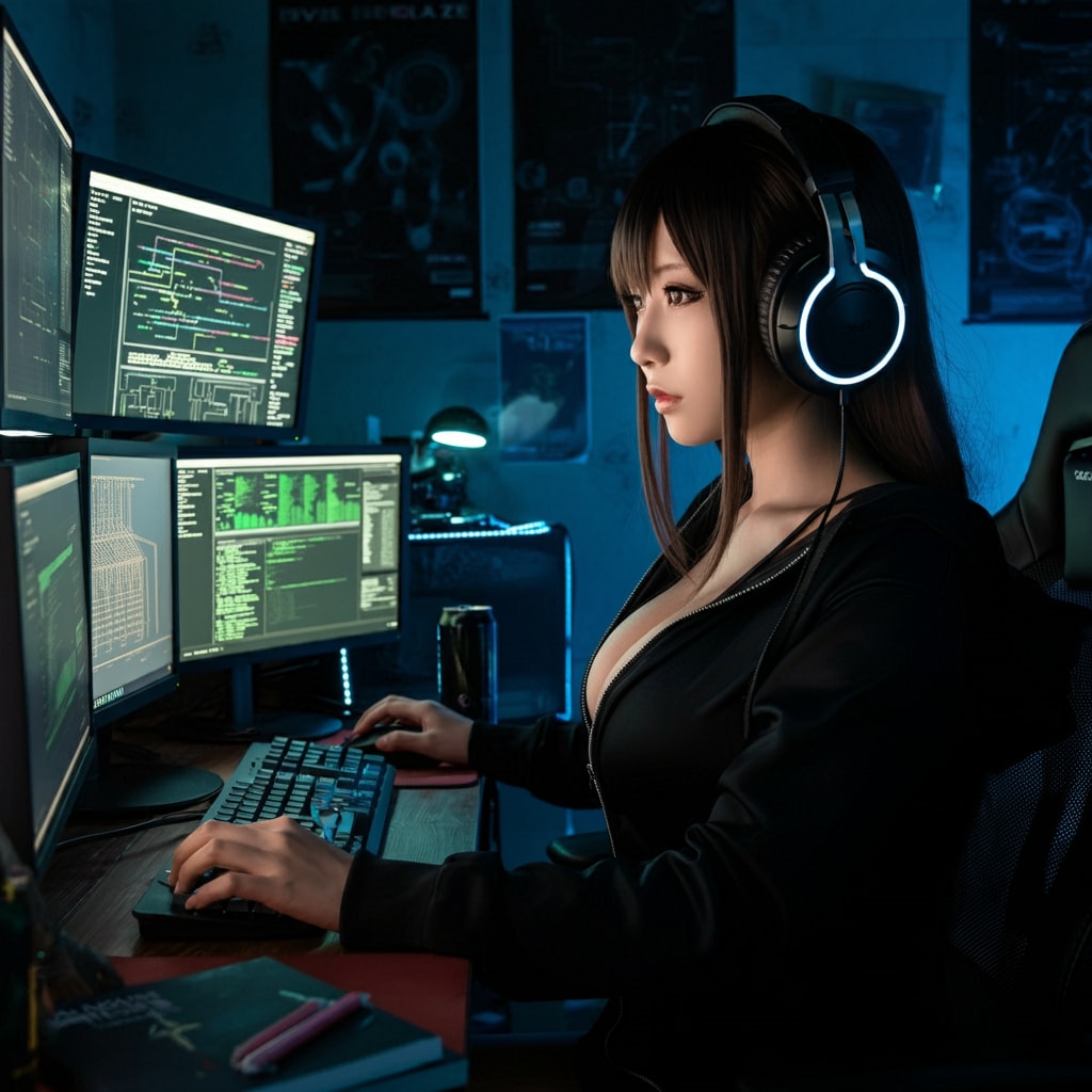 Photograph of a young Japanese female,from gravure idol, in a dimly lit room.gigantic bust yet skinny body , She's sitting at a cluttered desk, illuminated mainly by the glow of multiple computer monitors. Wearing a dark revealing hoodie and glowing headphone. Her expression is focused, eyes fixed on the central screen. The monitors display complex lines of code and data streams. On the desk are scattered tech gadgets, an energy drink can, and a glowing mechanical keyboard. The background shows posters with technical diagrams barely visible in the low light. A soft blue glow from an unseen LED source adds atmosphere. High-resolution image with emphasis on the contrast between the dark room and the lit screens, capturing the intense concentration on the woman's face.