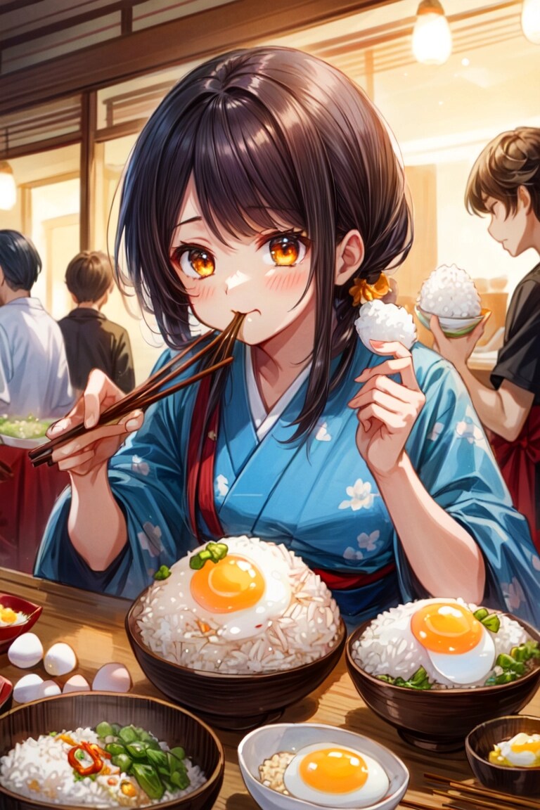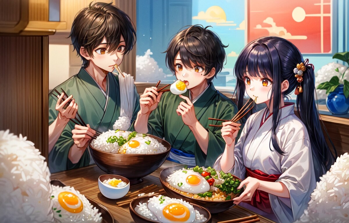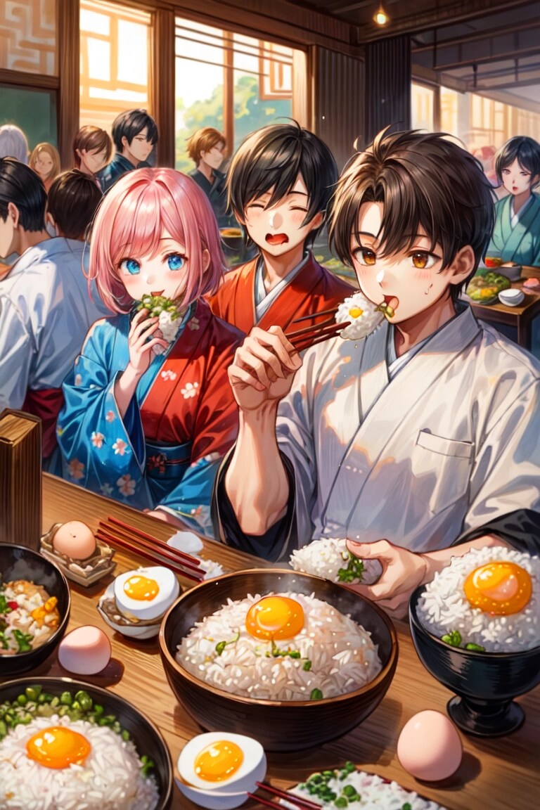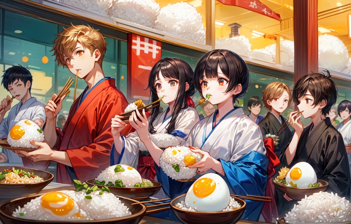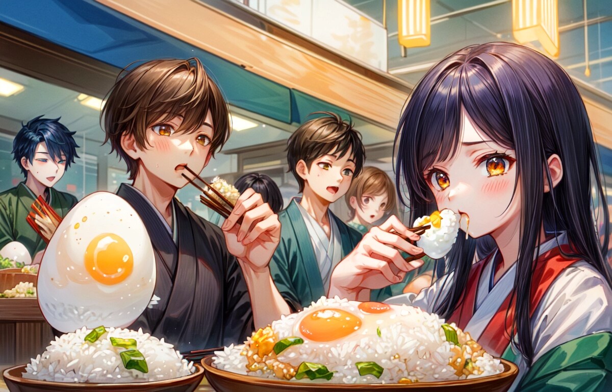 ではみんなでたまごかけごはんを食べる、レトロモダン街の少年少女をご覧下さい!!