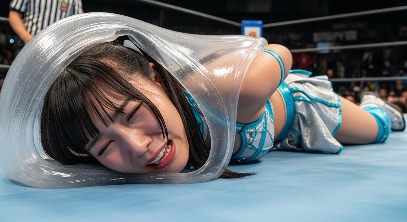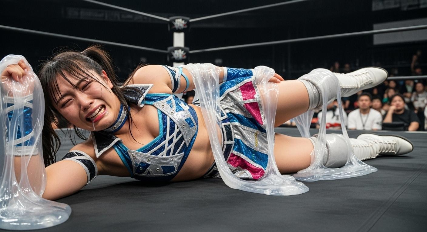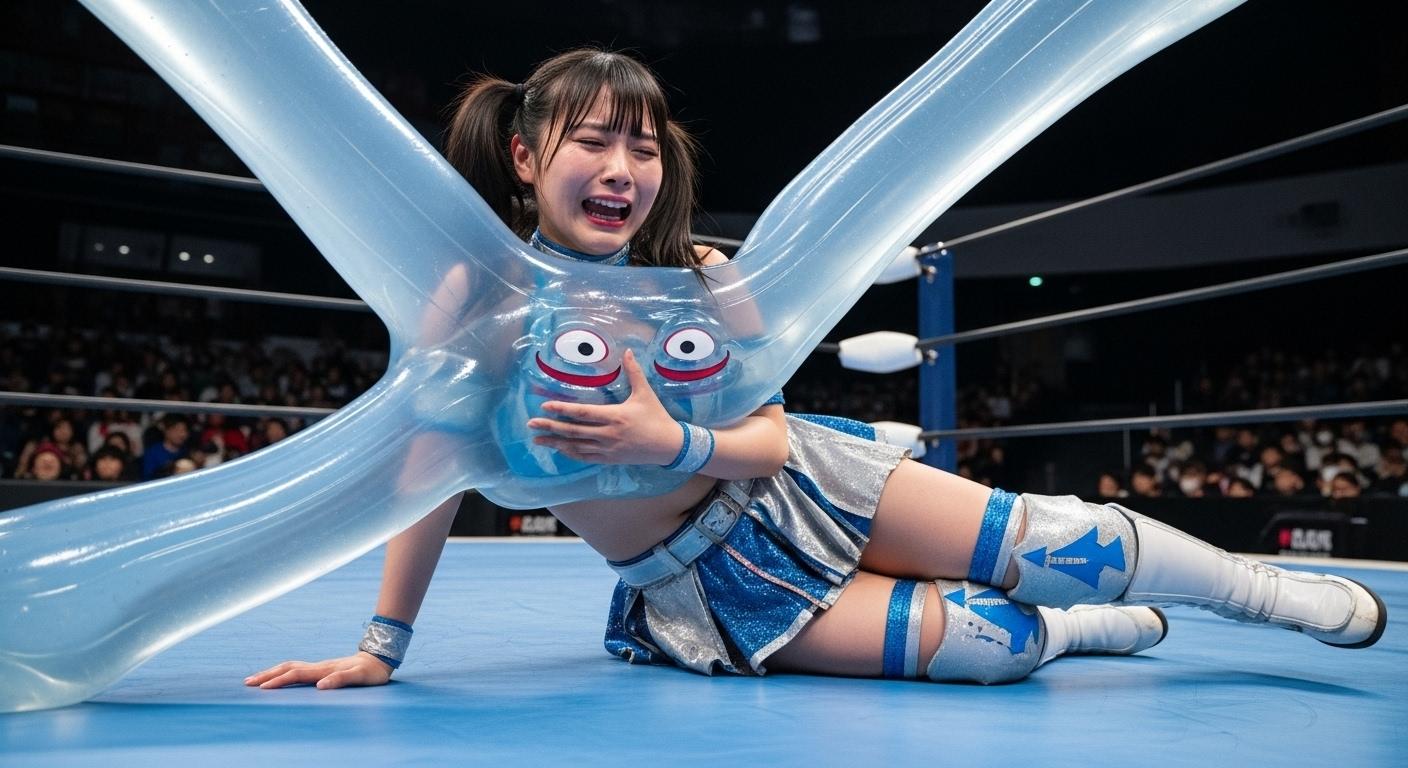 異種格闘プロレスでスライム(液体)との試合中に体に纏わりつかれるMIKURU