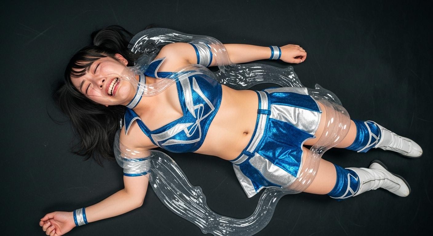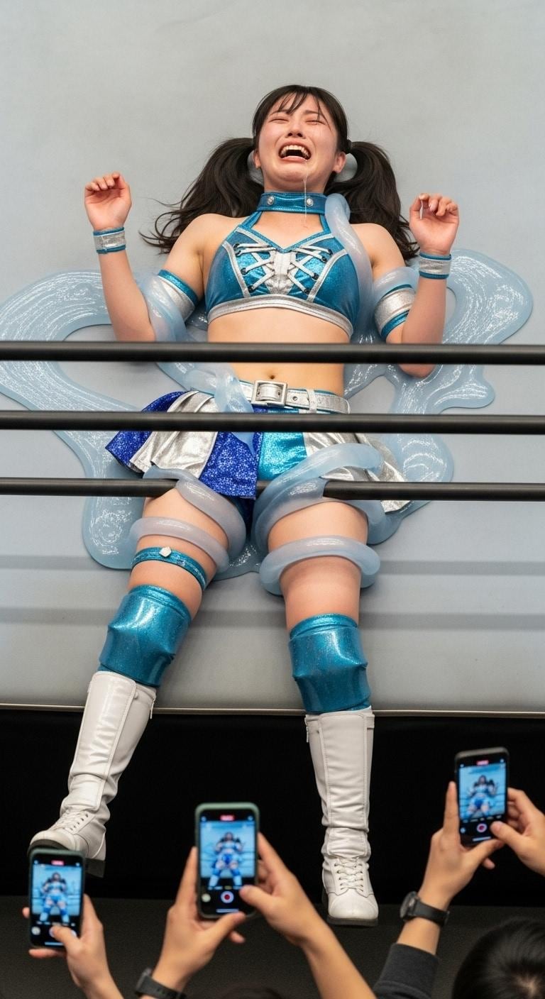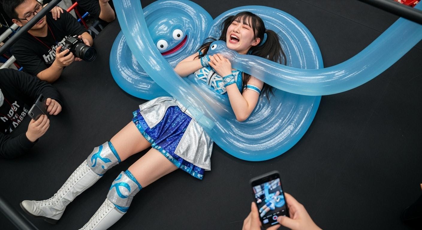 異種格闘プロレスでスライム(液体)との試合中に体に纏わりつかれるMIKURU