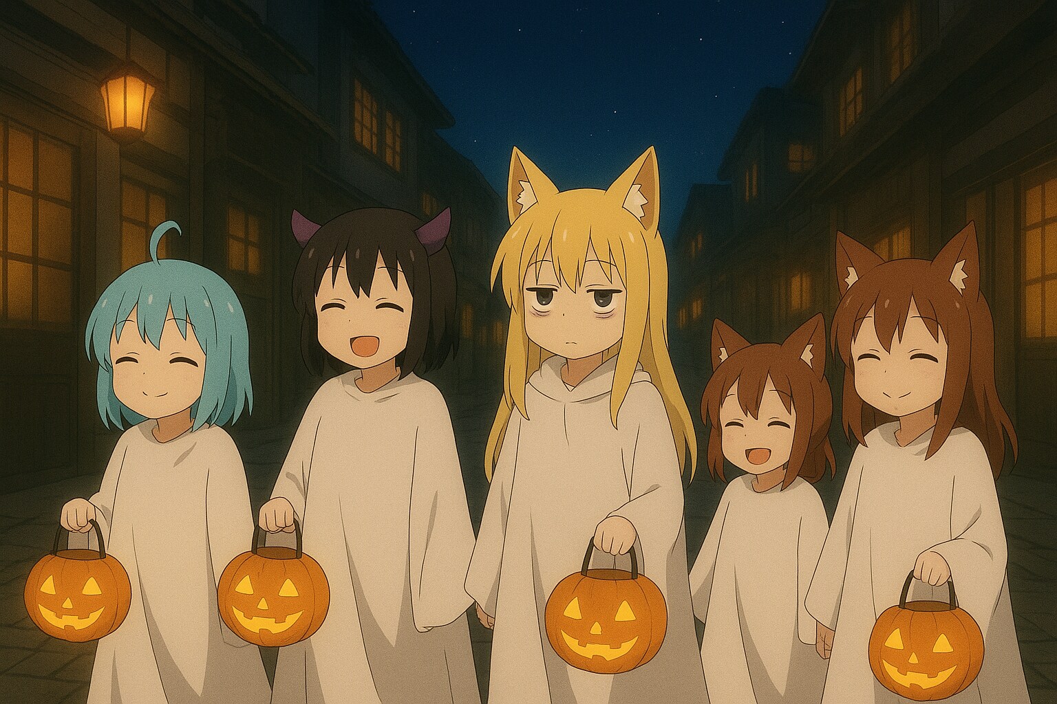 夜更かし想定内でお菓子集めのリハーサルをする多種族