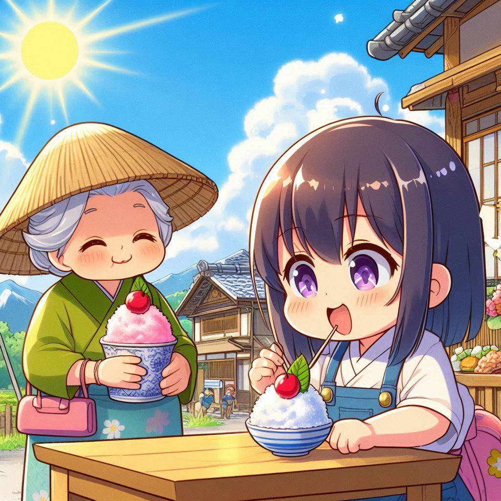 田舎のおばあちゃんちに行ったよ。いっしょにかき氷を食べたよ。冷たくておいしかったよ。