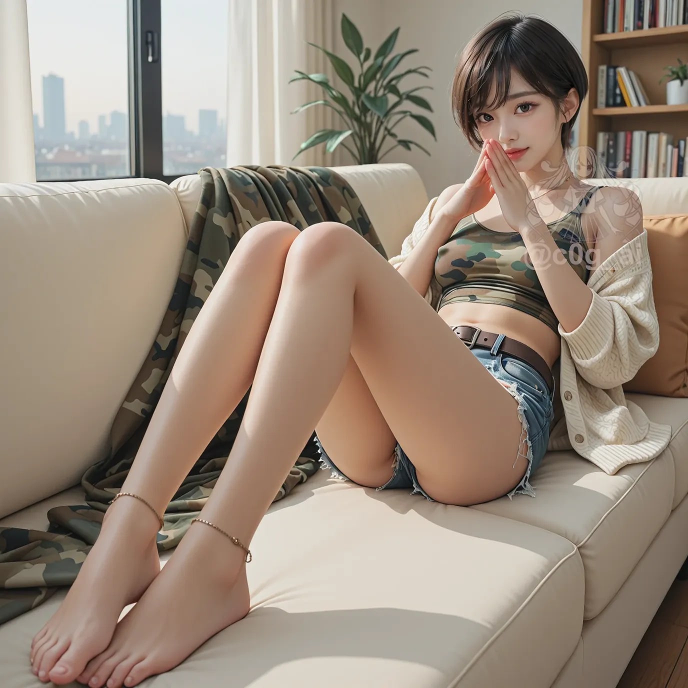 Camo tank top, frayed denim shorts, and a soft cardigan slipping off her shoulder.