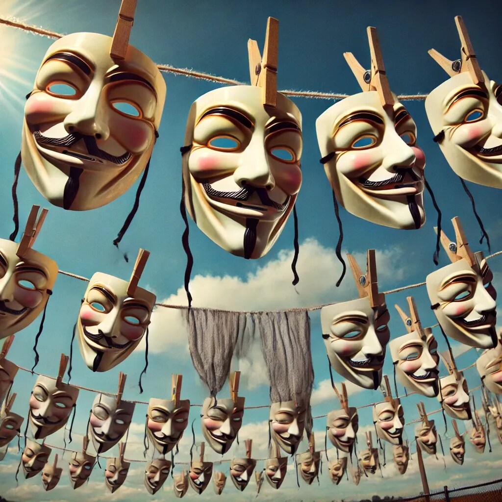 青空の下、次々とマスクが整えられている姿は、なんともユーモラスで、不思議な儀式のように感じられます。