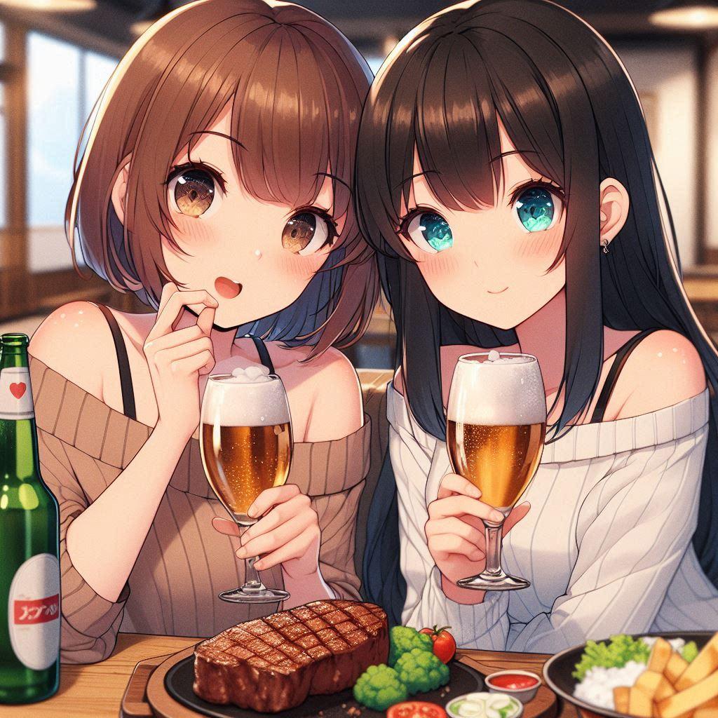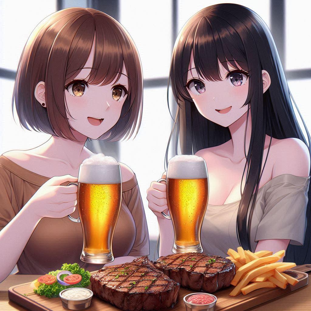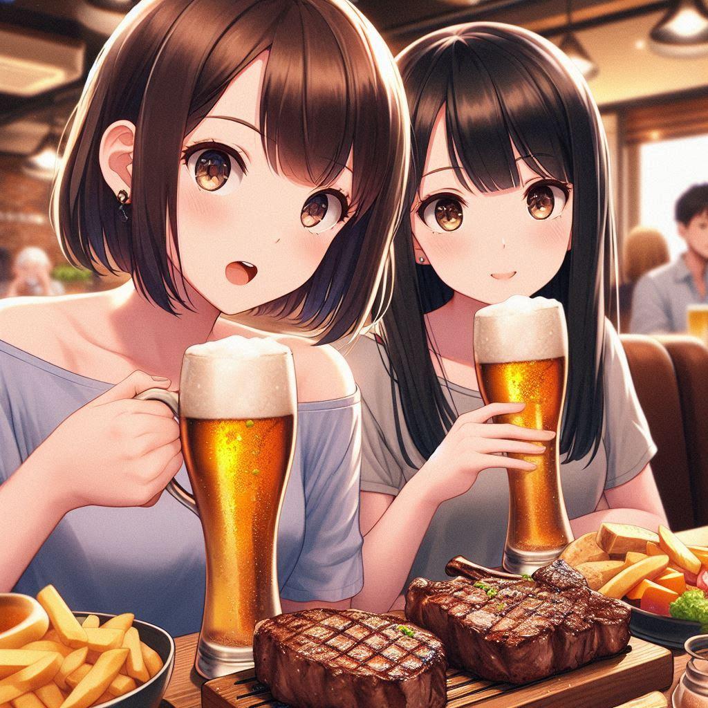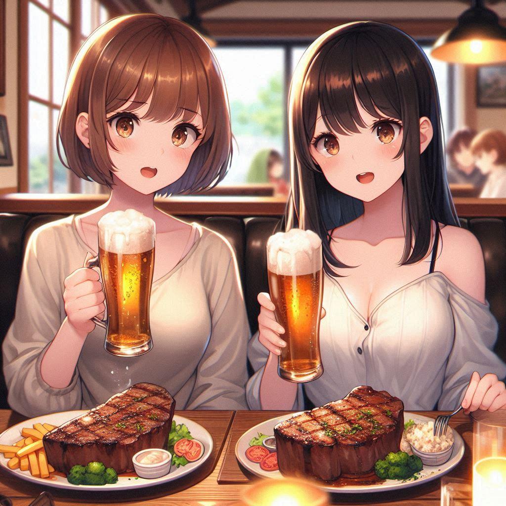 アキ「(店員呼んで)ビール3つお代わりとぉ~ステーキをキロでおねがいしま~す!」