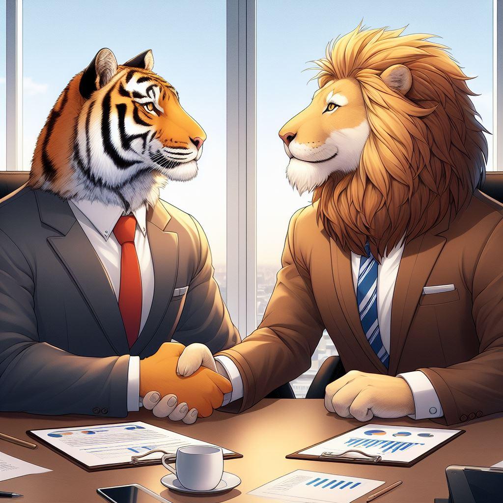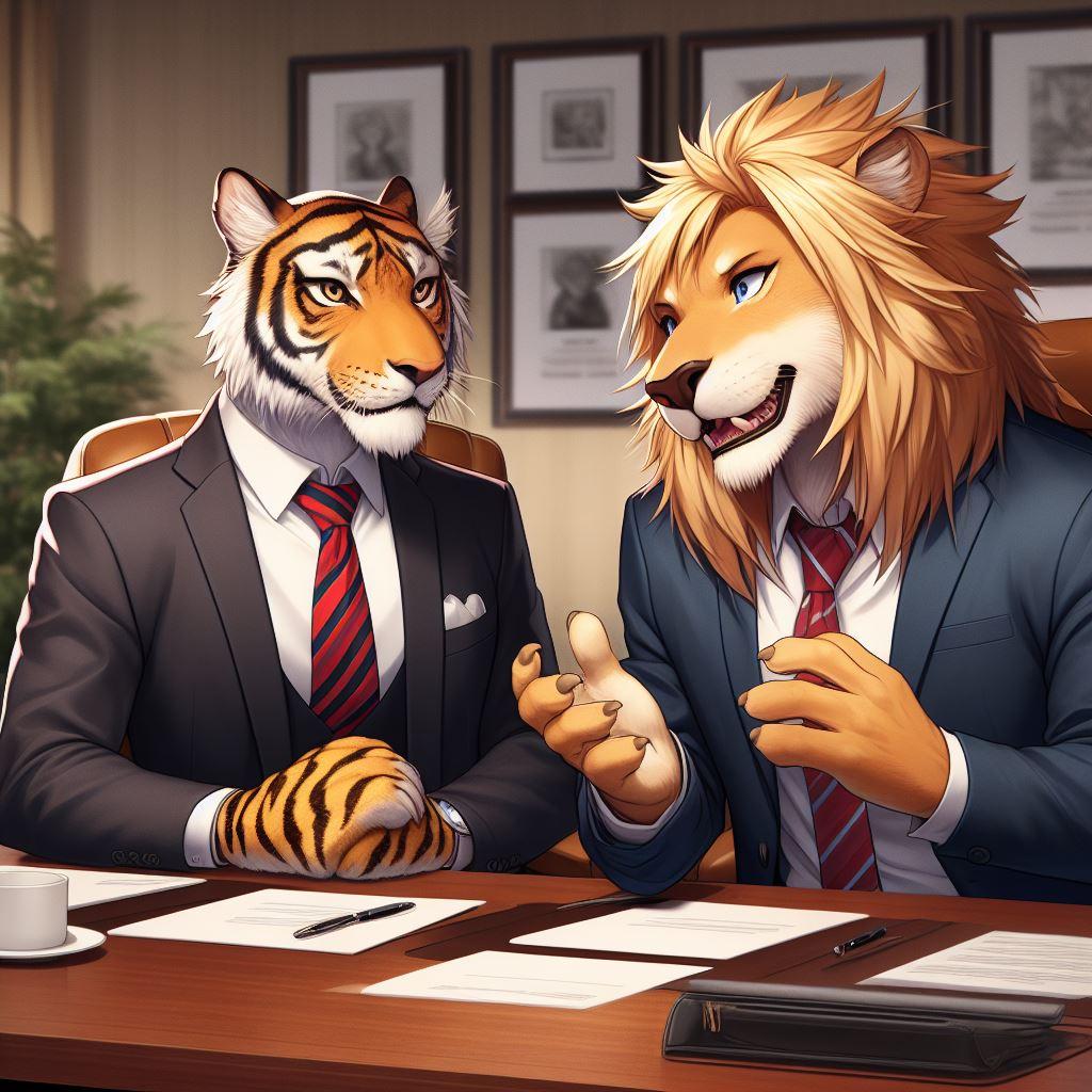 ビジネスマンとなった虎とライオンのビジネス会議。