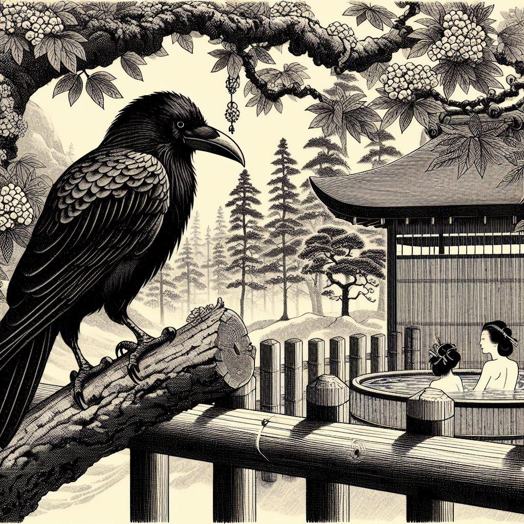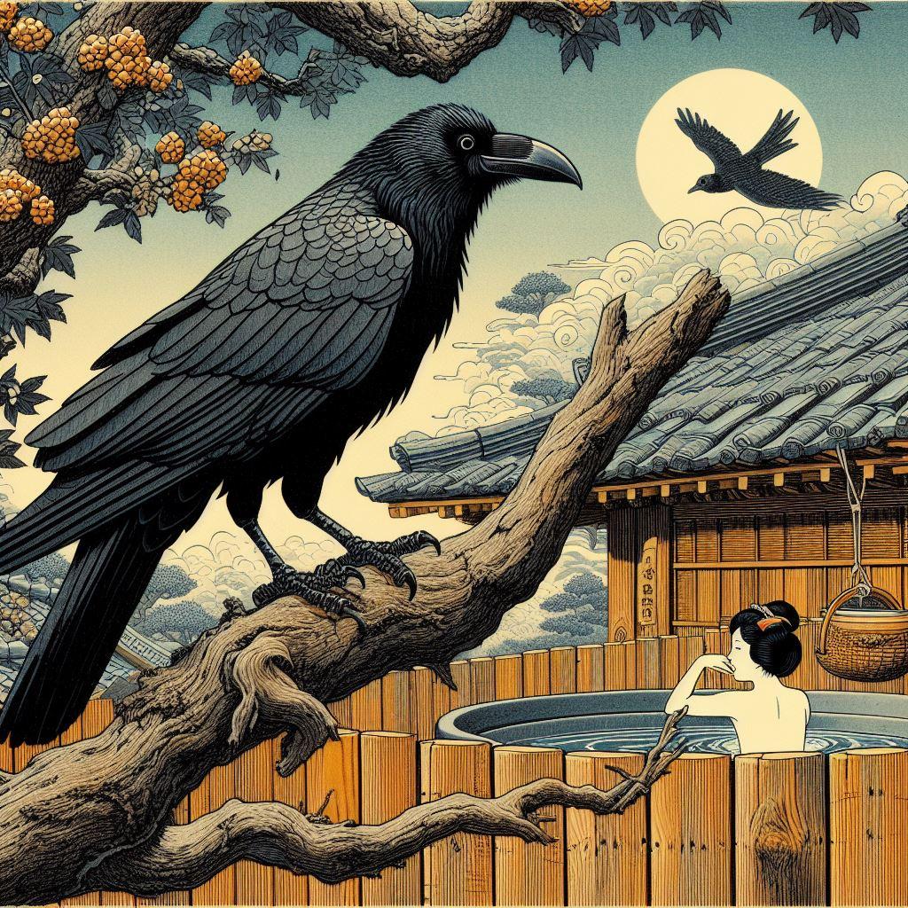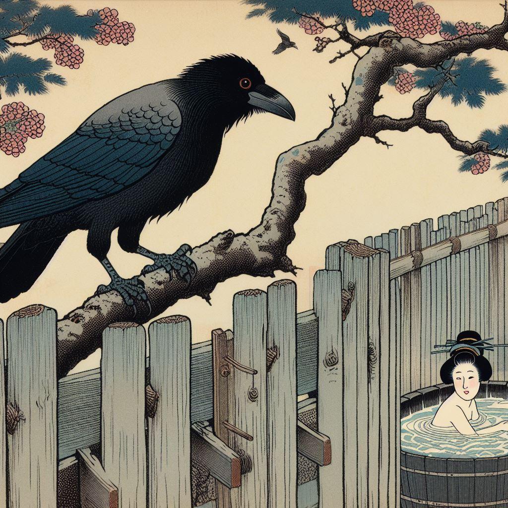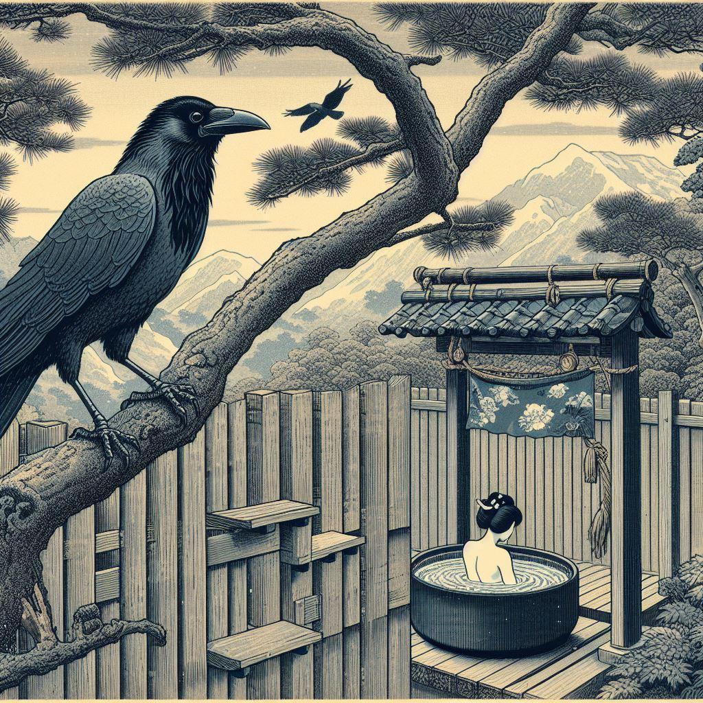 庭先で行水をする女(作者にその姿は見えていないが水の音や雰囲気でなんとなくわかる、あるいは垣の隙間などから垣間見えたか?)を木の上から烏が見ている(ように見える)。という光景を洒落っ気まじりに詠んだのでしょう。