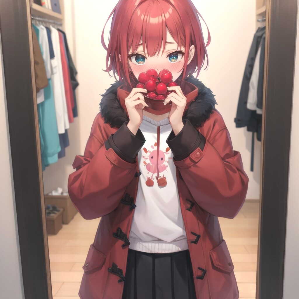 秋物のコートを試着するねい。鏡に映る自分の姿と、横から見守るあなたに気づき、恥ずかしそうに俯いてしまう。