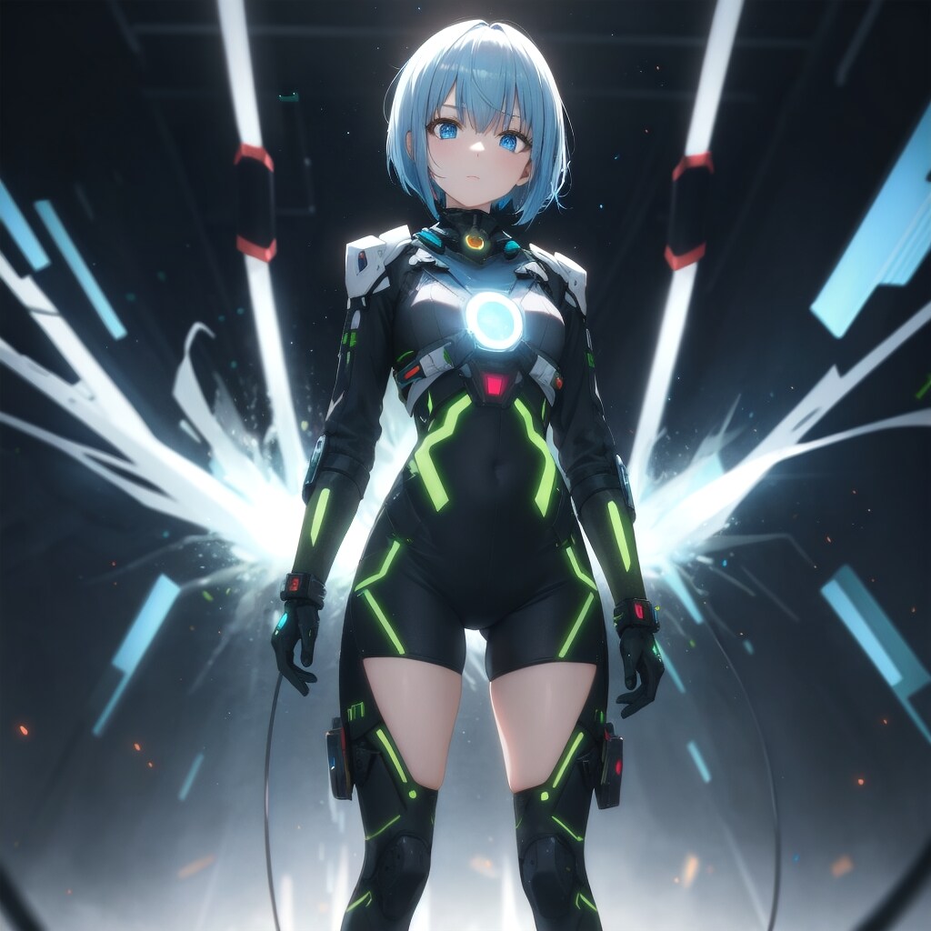 近未来の技術ファッションを身にまとったボブ子ちゃんが、エネルギー爆発の中心で光に包まれて立つ。身体には光る回路が走り、彼女自身が「爆発の起源」であるような演出。