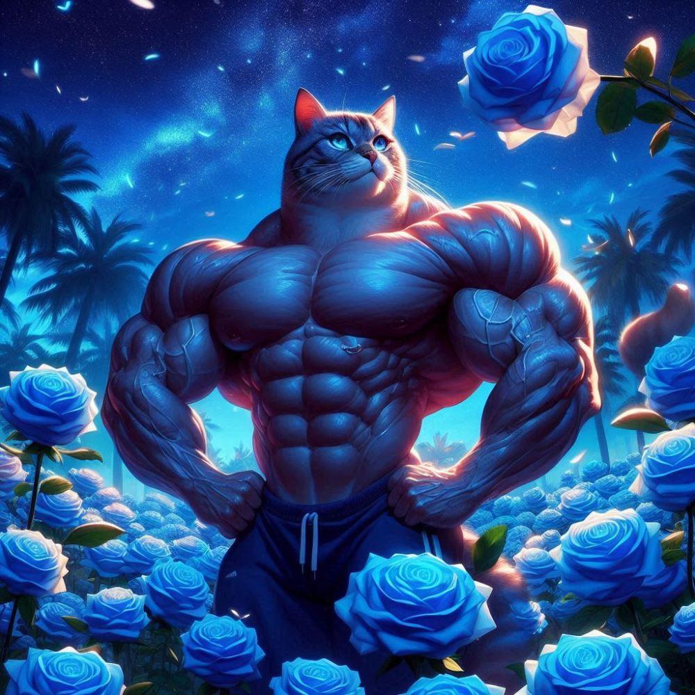 アニメ風、真夜中の青い薔薇の花園&ポージングするボディビルダー筋肉猫
