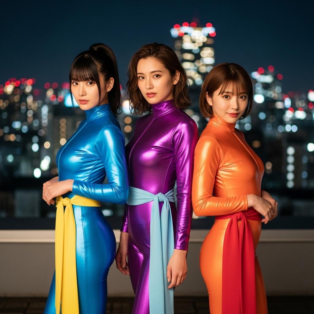 minamiさんからの「体を寄せ合って背中合わせに姿勢よく立つ」のご助言を加えて生成してみました。