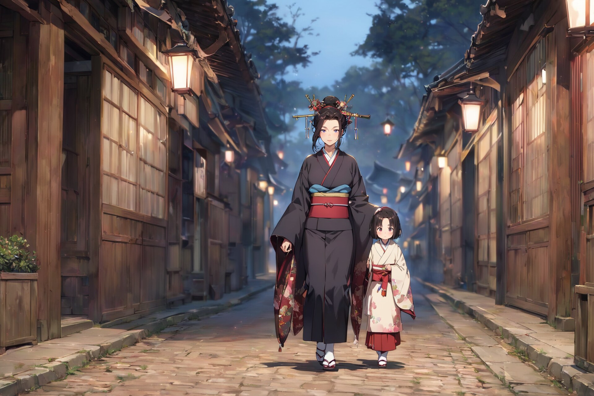 大好きな姐さんを迎えに来たが夜道が怖くて帰れなくなった禿さんと一緒に帰る姐さん、です。