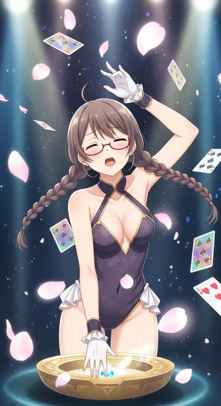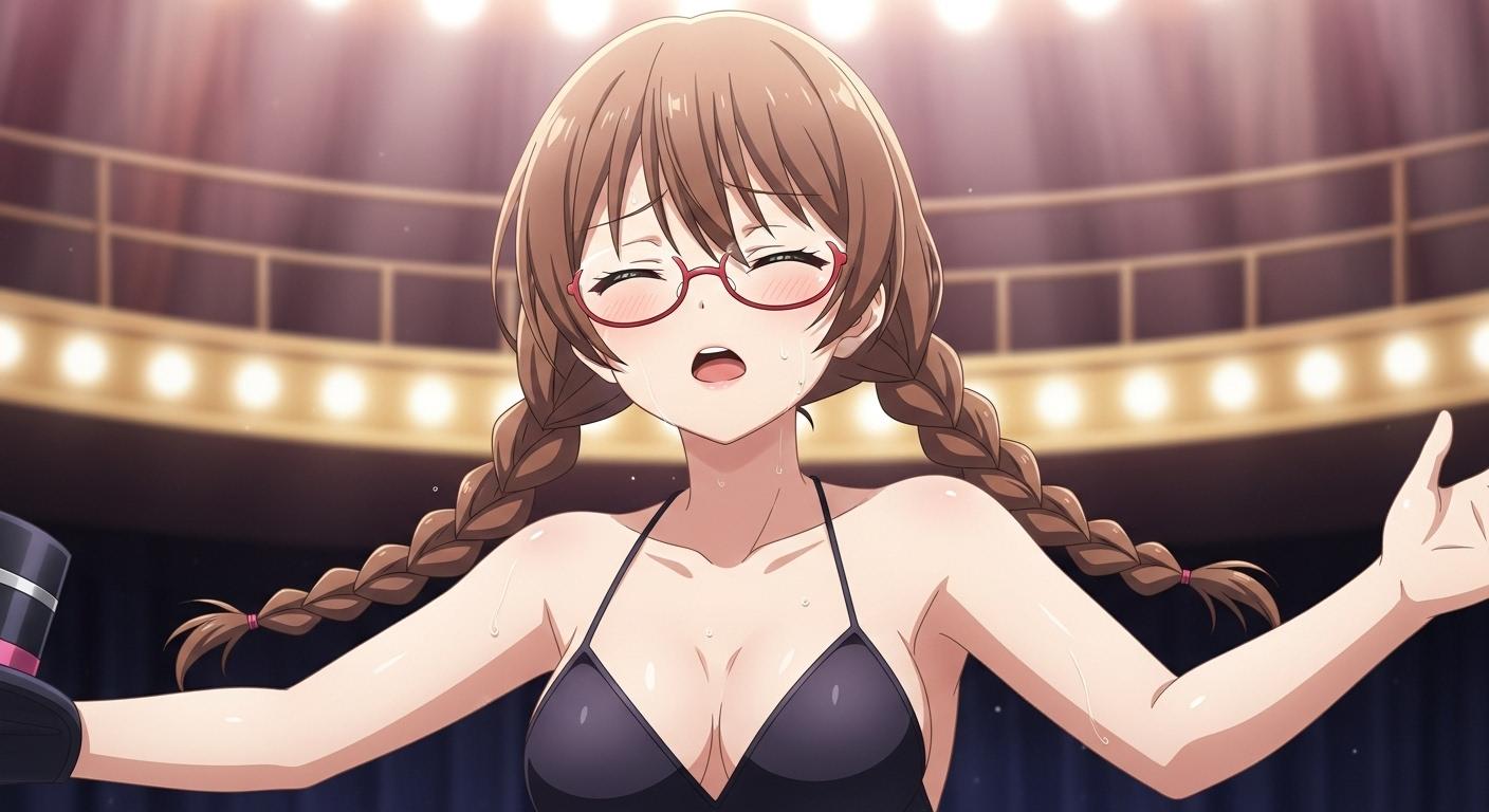 1枚目、(サムネ)マジシャン衣装の装飾を吹き飛ばされレオタードのみの状態で、正義の必殺技をくらい悶える三つ編み眼鏡っ娘の悪の美少女マジシャン💦・・ちなみに、悶えるお顔と滴る汗の組み合わせはImageFXの生成拒否率半端ないです😖💦(私は失敗続きで諦めましたが💦これで全身描写にチャレンジしたら何度失敗するか想像したくないです😖💦)